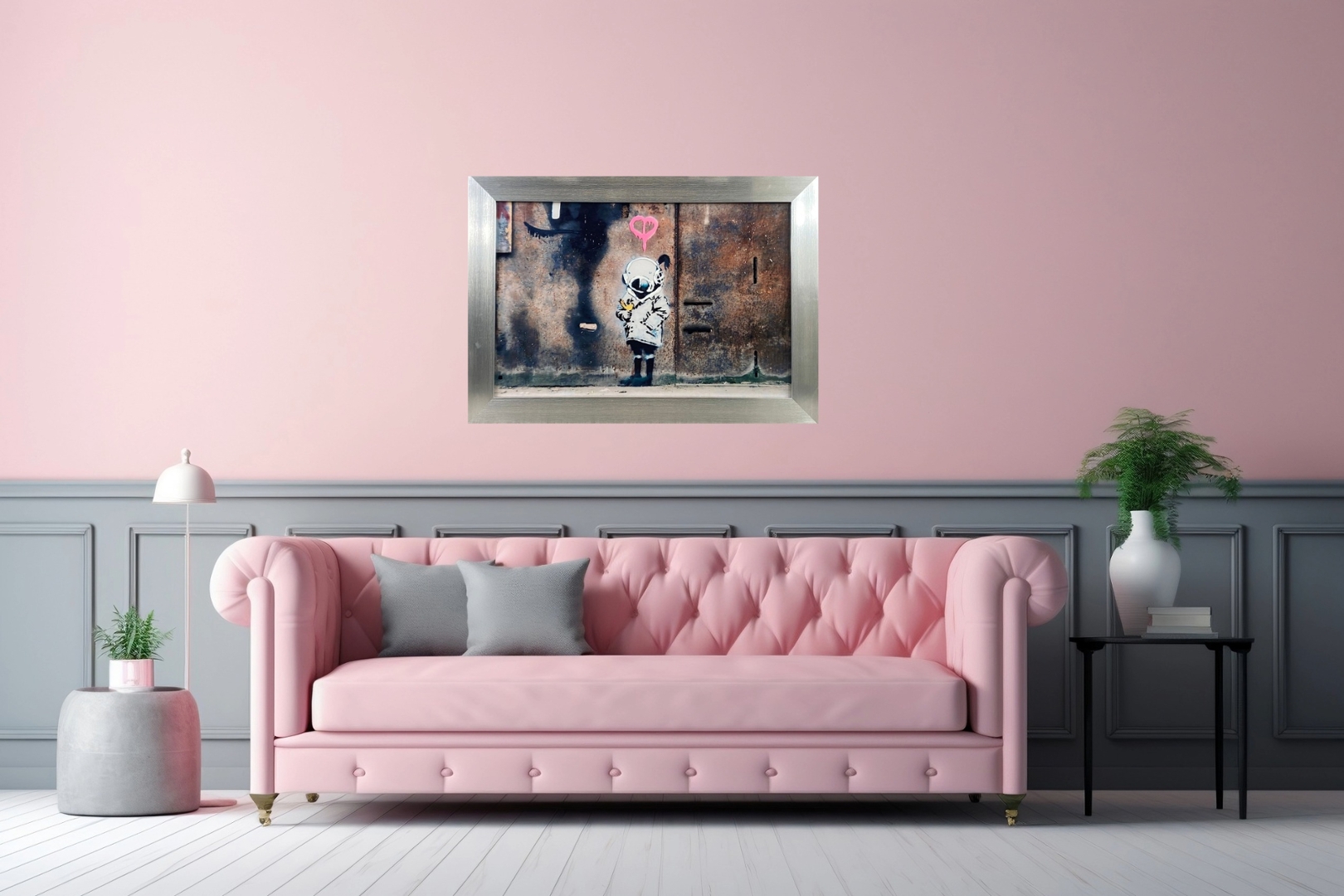 Within its silver frame, "Space Girl and Bird" transcends conventional boundaries of art, offering a glimpse into a world where dreams and reality intersect. Banksy's work continues to inspire dialogue on the wonder of discovery and the profound connections that define our human experience.