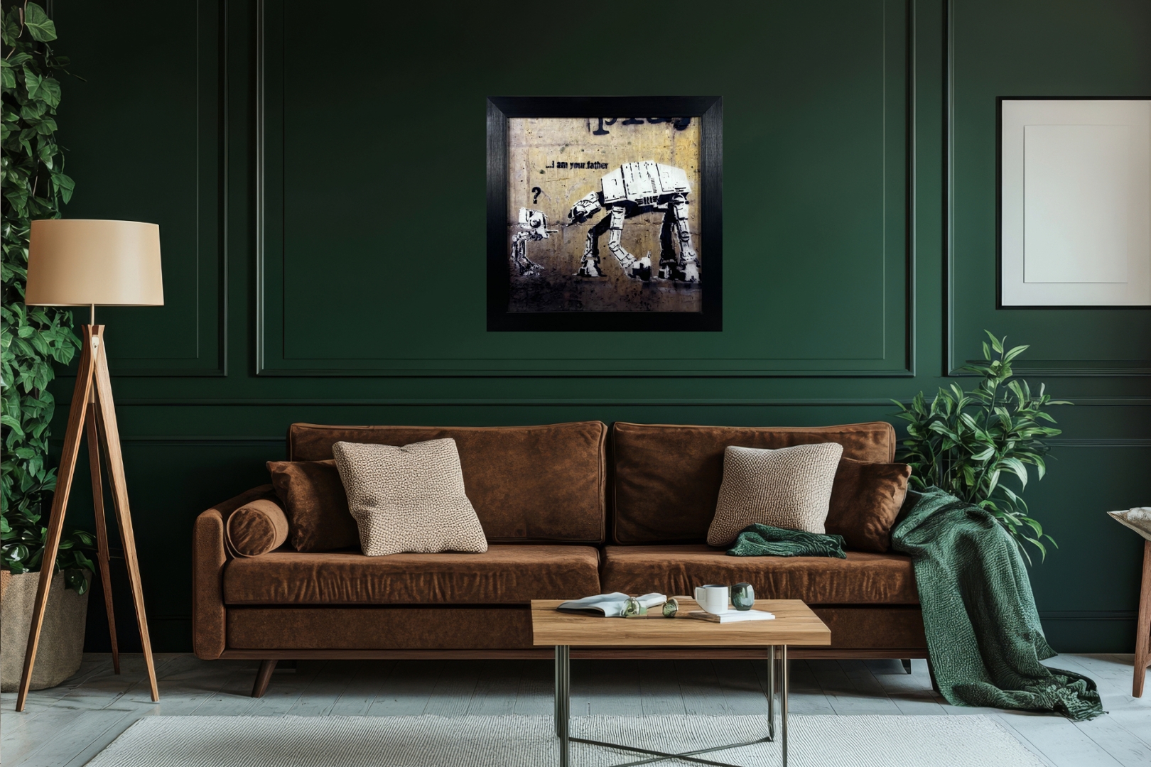 The black frame surrounding the artwork provides a sleek and modern contrast, framing the robotic reinterpretation of the iconic Star Wars moment while emphasizing Banksy's satirical commentary on popular culture and societal norms. Positioned in any space, from galleries to private collections, the artwork invites viewers to engage with its playful critique of media influence, identity, and the dynamic between heroes and villains as portrayed in iconic narratives like Star Wars.