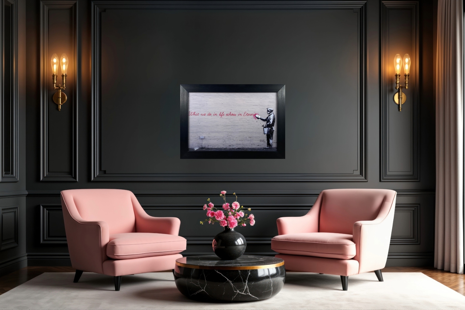 "What We Do In Life Echoes In Eternity" by Banksy is a profound and contemplative liquid art piece that invites viewers to reflect on the lasting impact of their actions. Presented in a sleek black frame, this artwork measures 30 inches in height and 38 inches in width, creating a visually striking and balanced composition. The black frame adds a touch of modern sophistication that enhances the artwork's contrast and thematic depth, framing it with clarity and focus.