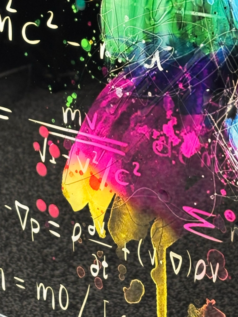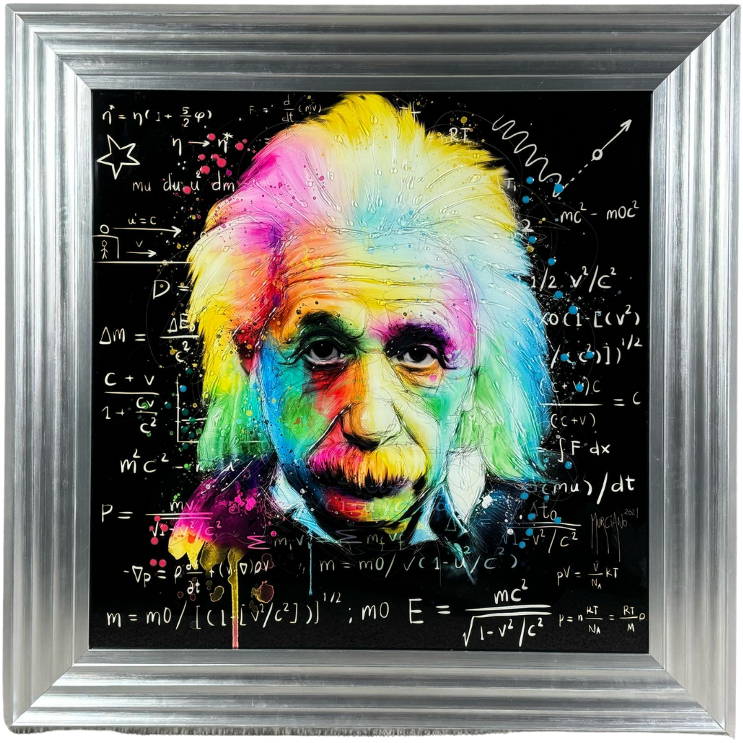 The silver frame adds a sleek, modern contrast to the kaleidoscopic background, giving the artwork a clean, polished finish that enhances its presence in any space. Einstein's image is cleverly woven into a chaotic yet controlled palette that symbolises both genius and creative freedom, inviting viewers to think differently and embrace the unexpected.