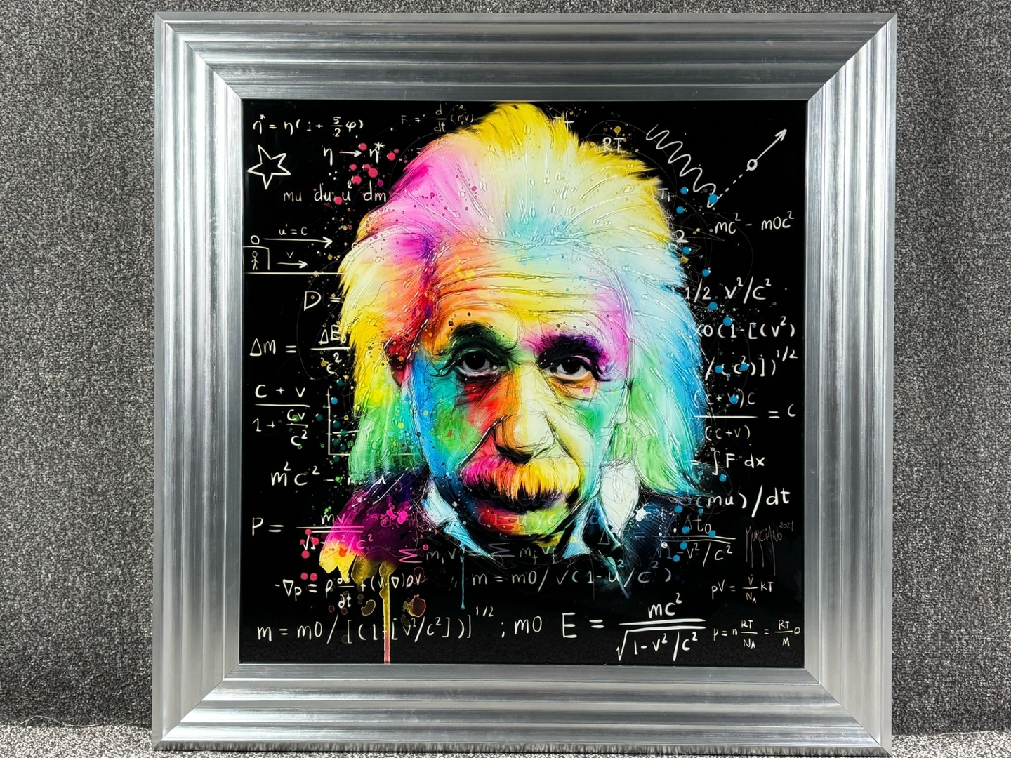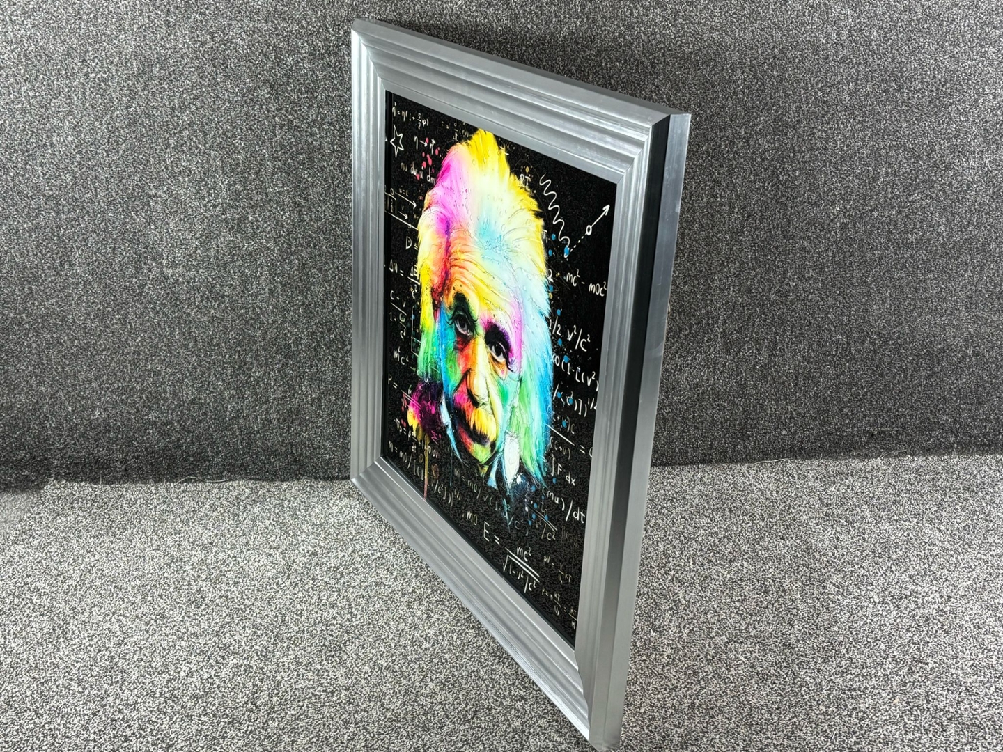 A brand new silver framed liquid art picture of a Colourful Albert Einstein.