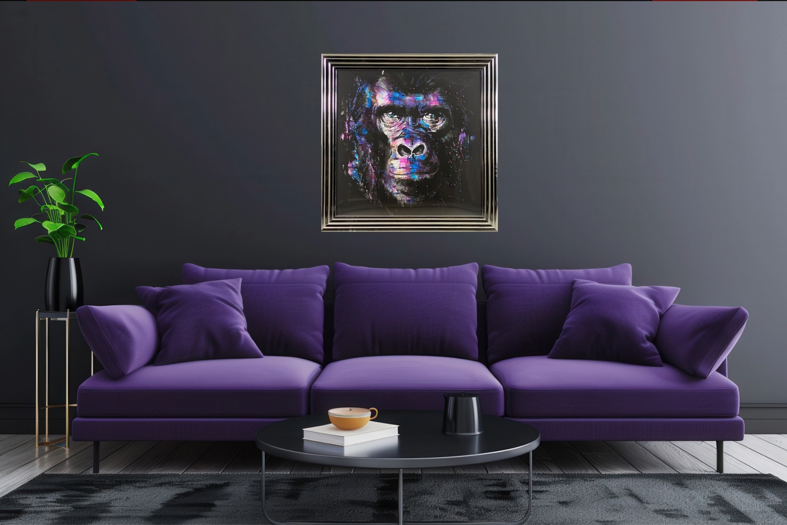 Encased within a sleek frame, this piece is a bold statement for any space. Whether displayed in a modern living room, a funky office, or a contemporary art gallery, "Vibrant Ape" is sure to captivate viewers and add a touch of whimsy to the environment.