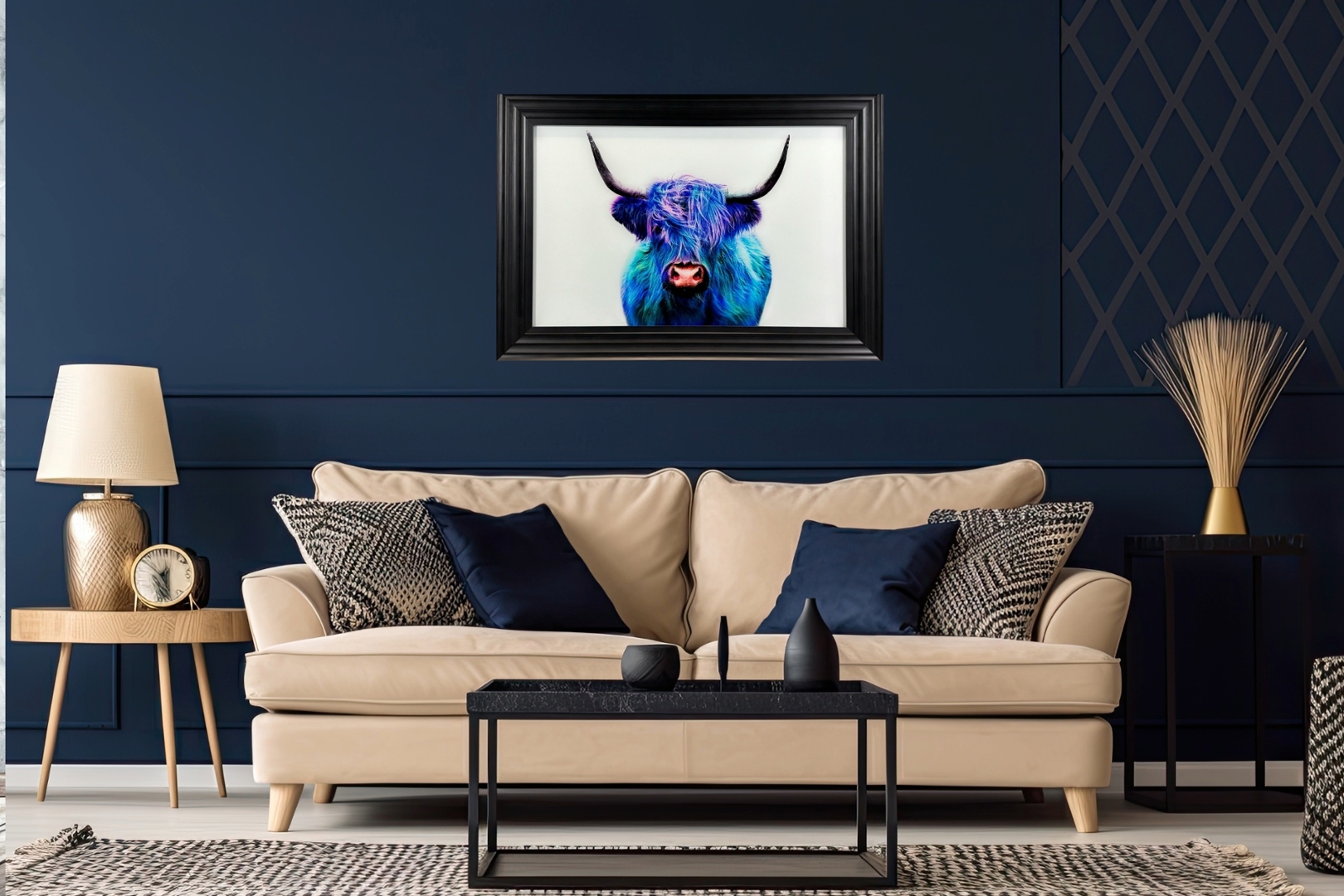 A brand new black framed liquid art picture featuring a vibrant, colourful Highland Cow. Measuring an impressive 102cm in height and 72cm in width, this eye-catching piece demands attention with its electrifying palette of vivid blues, purples, and hints of neon green. The iconic Highland Cow, known for its wild hair and majestic horns, is reimagined here in a modern, almost cosmic twist, making it perfect for statement interiors or eclectic gallery walls.