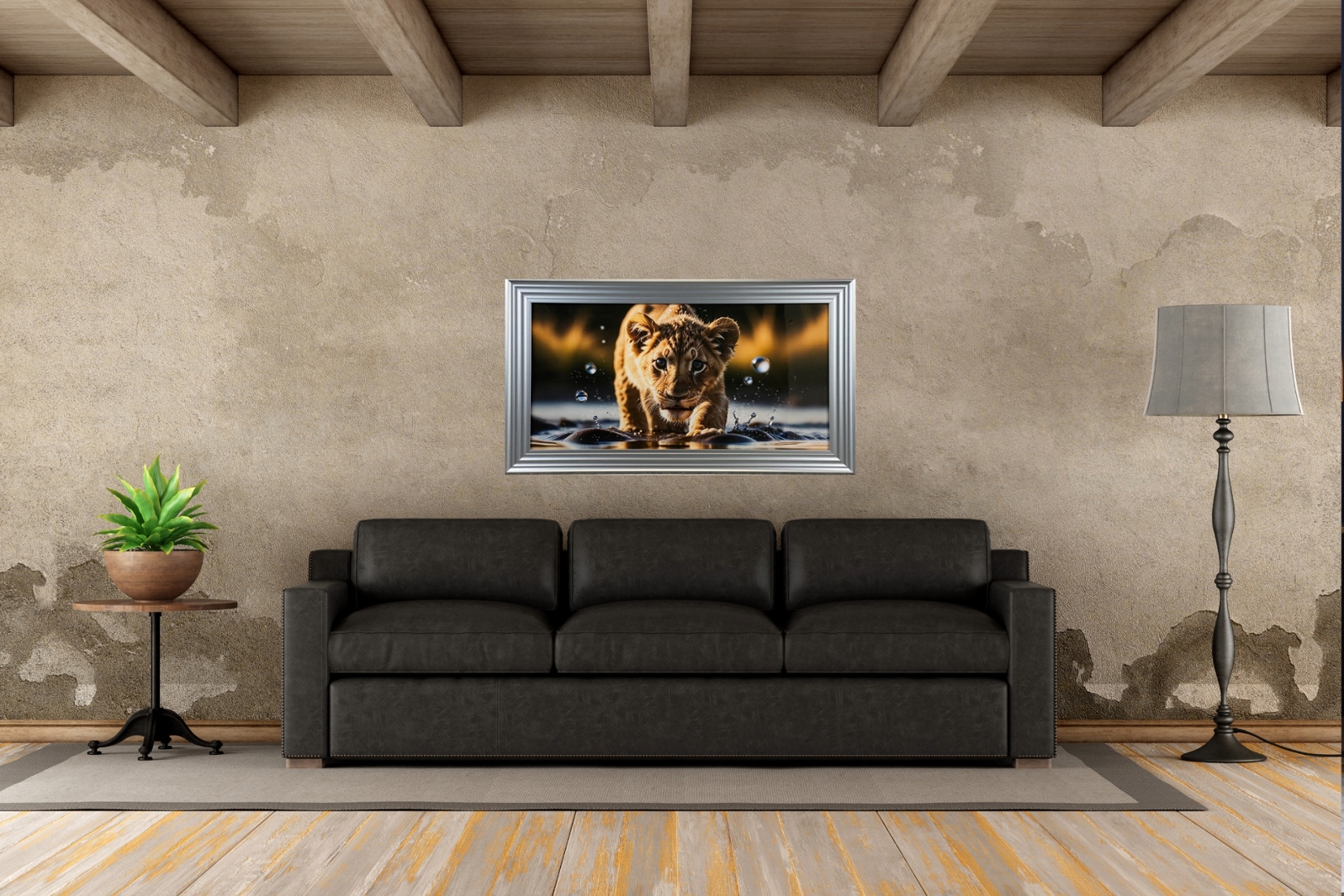 The silver frame serves as a refined accent, its sleek lines and polished finish enhancing the artwork's contemporary allure while providing a sense of structure and containment. Against this backdrop, the Colourful Hunting Lion Cub emerges as a symbol of innocence and wonder, inviting viewers to marvel at the beauty and diversity of the natural world.