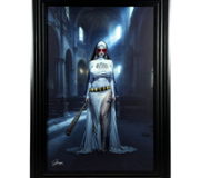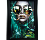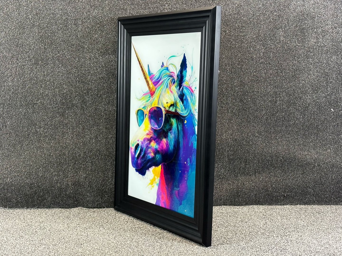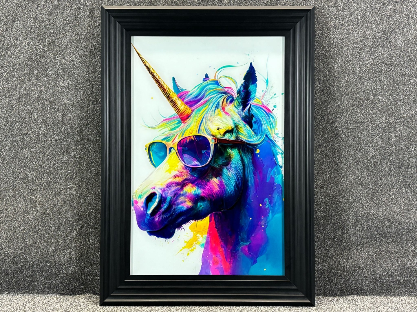 A brand new black framed liquid art picture of a Colourful Unicorn with Shades.