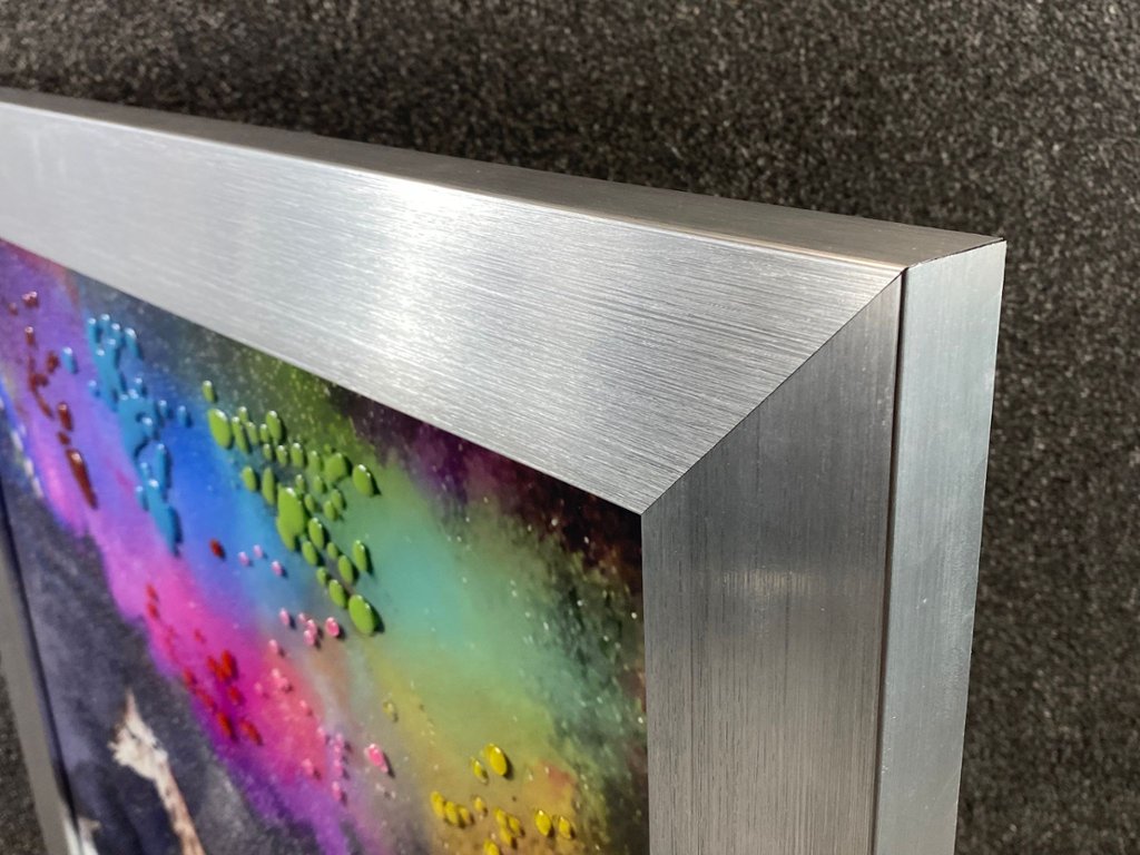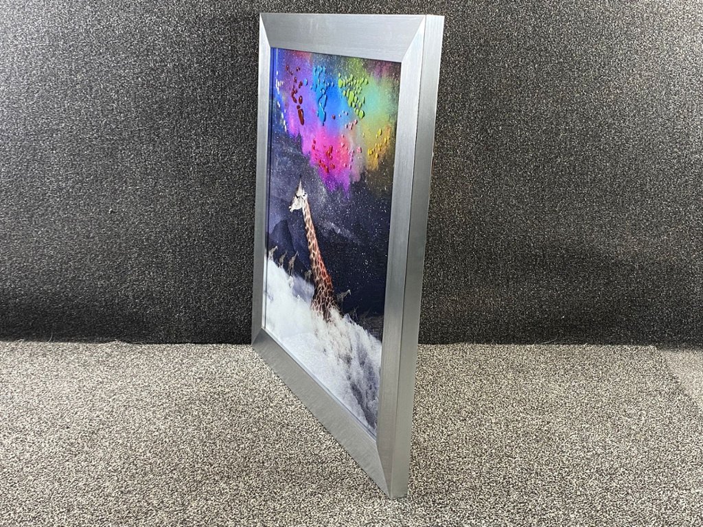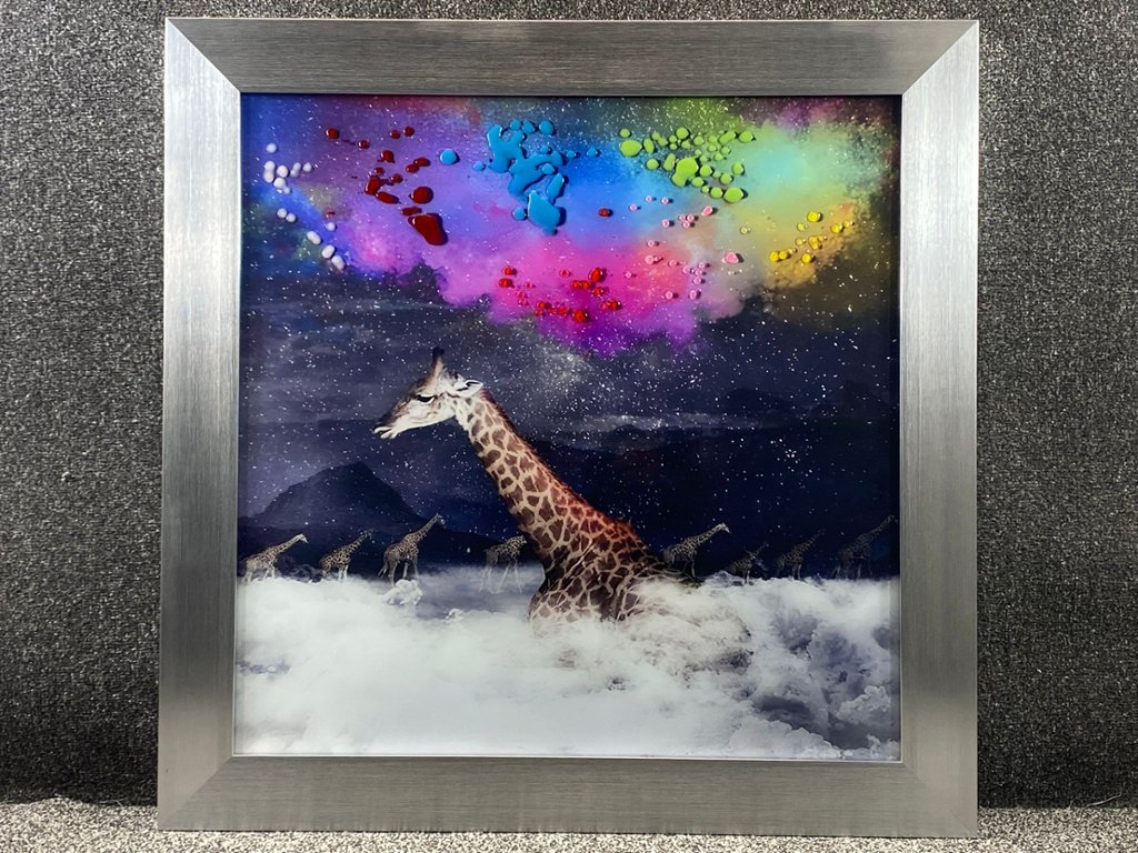 A brand new silver framed liquid art picture of a Giraffe with Colourful Smoke.