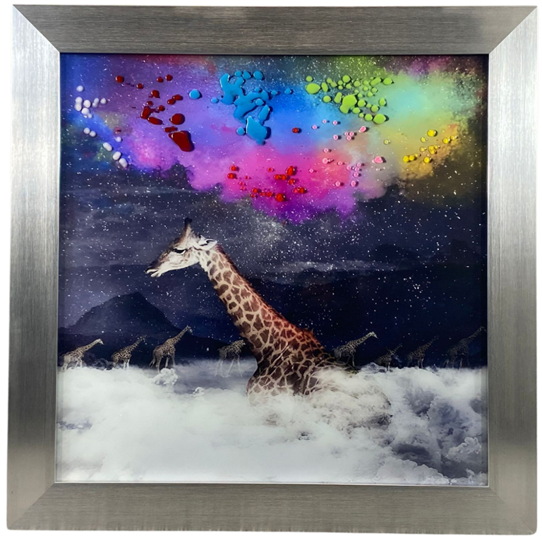 Within its silver frame, "Giraffe with Colourful Smoke" not only celebrates the splendour of wildlife but also prompts contemplation on the delicate balance of ecosystems and the interconnectedness of all living things. The artwork serves as a captivating reminder of the beauty and diversity found in the natural world, urging us to cherish and protect these precious treasures.