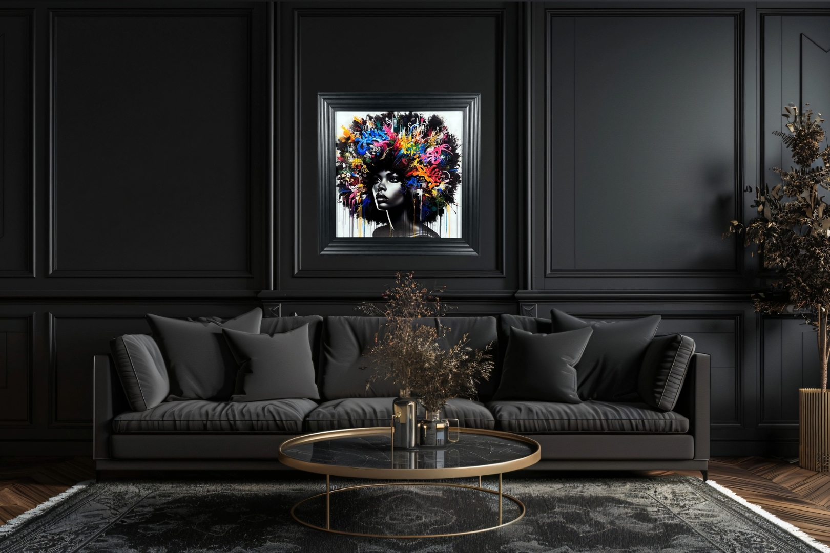 A brand new black framed liquid art picture of a Graffiti Haired Girl. Measuring 86cm in height and 86cm in width, this captivating piece features a stunning monochrome portrait of a confident young woman, contrasted by a vibrant burst of graffiti-style colour erupting from her hair. Neon pinks, electric blues, fiery oranges, and vivid yellows collide in an abstract, urban symphony that feels alive with energy and attitude.