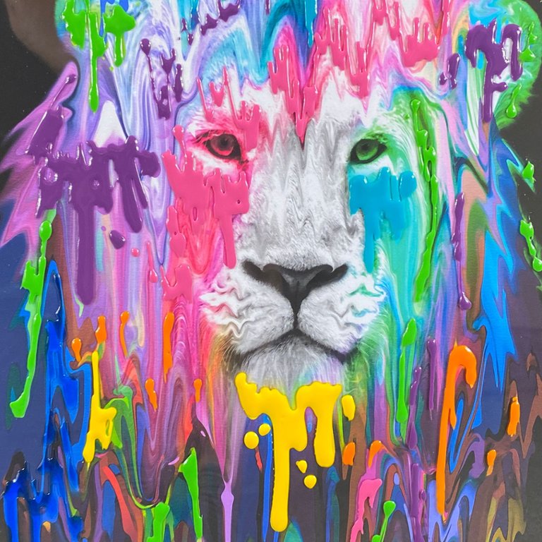 In this stunning artwork, the majestic lion emerges from a vibrant explosion of paint splashes, creating a dynamic and visually striking composition. The liquid art technique enhances the movement and texture of the paint, adding depth and dimension to the lion's mane and features.