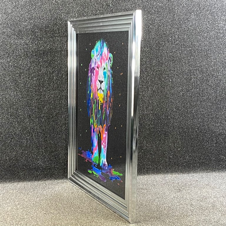 Perfect for adding a bold and contemporary touch to any space, "Paint Splash Lion" serves as a powerful statement piece in a living room, hallway, or office. Its sleek chrome frame complements the vibrant colours of the artwork, enhancing its modern aesthetic and commanding presence.