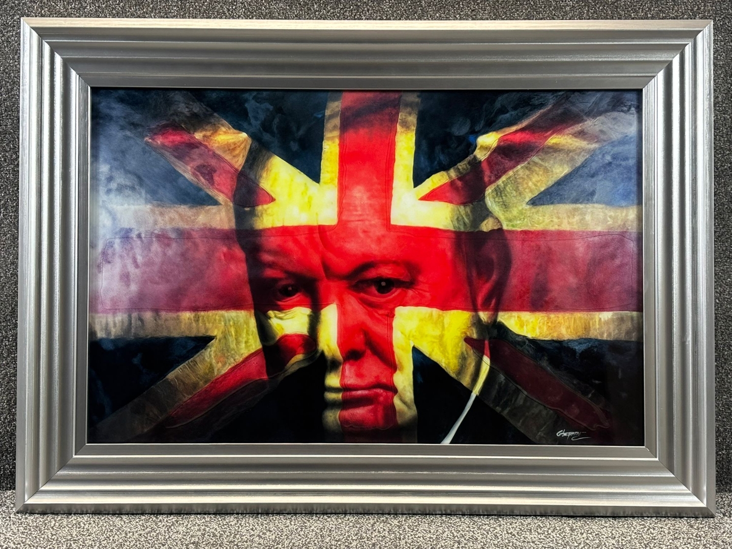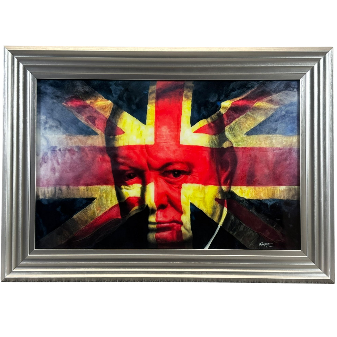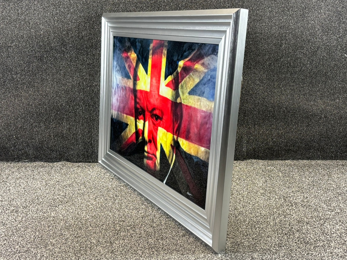 A brand new silver framed liquid art picture of a Union Jack Winston Churchill.