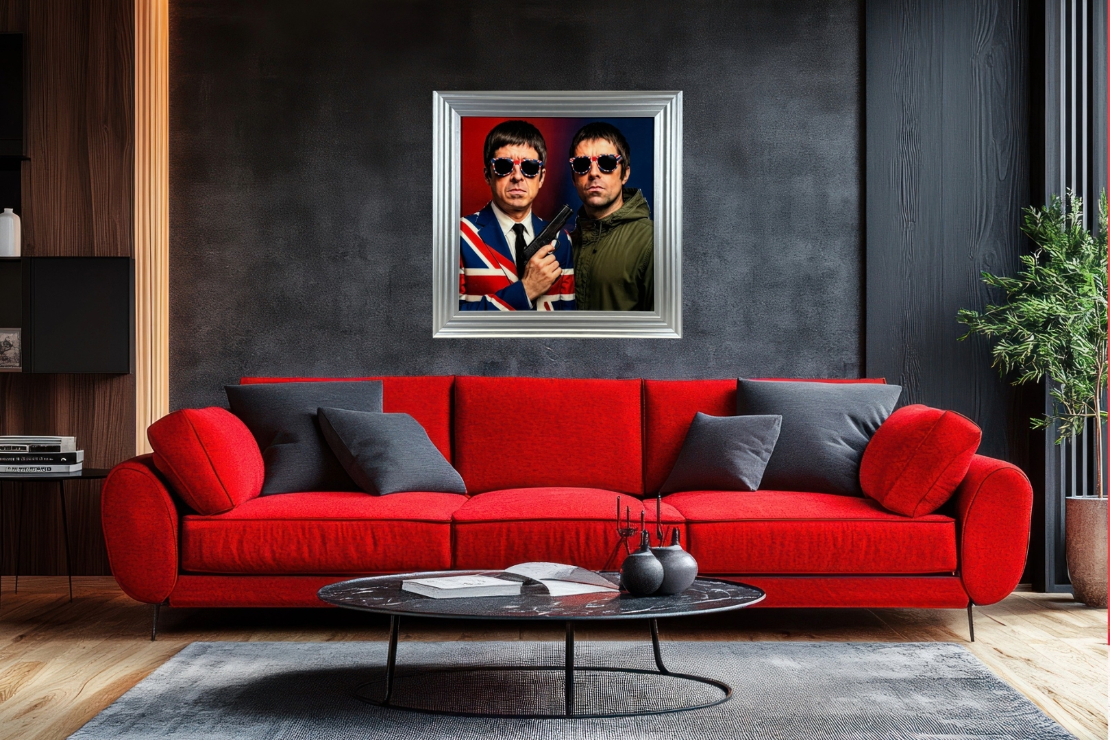 A brand new silver framed liquid art picture that delivers instant star power, this striking piece features a bold, modern portrayal inspired by Oasis, infused with unmistakable British attitude. One figure stands confidently in a sharp Union Jack suit holding a prop gun, while the other balances the scene with a cool, casual stance in a khaki jacket. Both wear Union Jack sunglasses, amplifying the artwork’s rebellious, iconic Britpop energy. The high-gloss liquid finish brings incredible depth and vibrancy to every colour and detail, creating a dramatic centrepiece that commands attention.