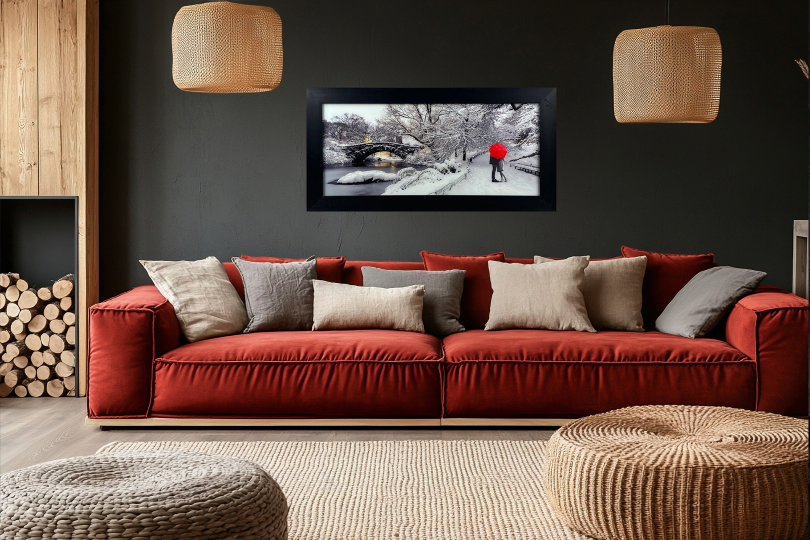 A brand new black framed liquid art picture of an Umbrella Couple in Winter Park Scene.