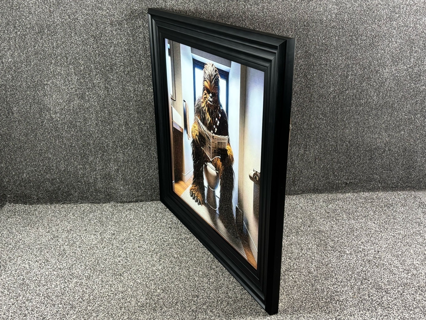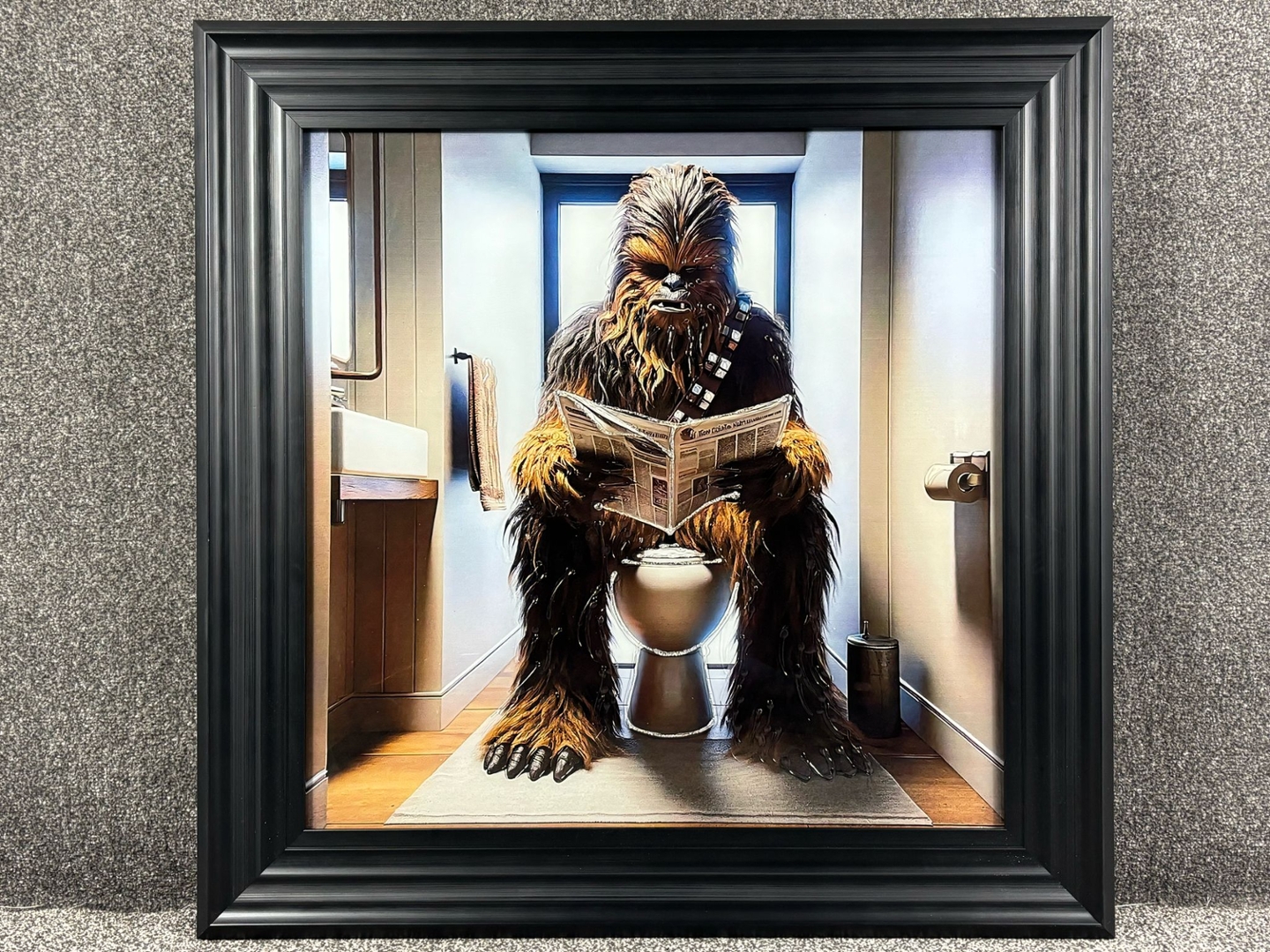 A brand new black framed liquid art picture, Chewbacca Reading The Newspaper is a humorous and imaginative twist on a sci-fi icon like you’ve never seen him before. Measuring 86cm in height and width, this quirky artwork captures the legendary Wookiee from Star Wars in a unexpected moment—sitting calmly on a toilet, engrossed in the daily news.