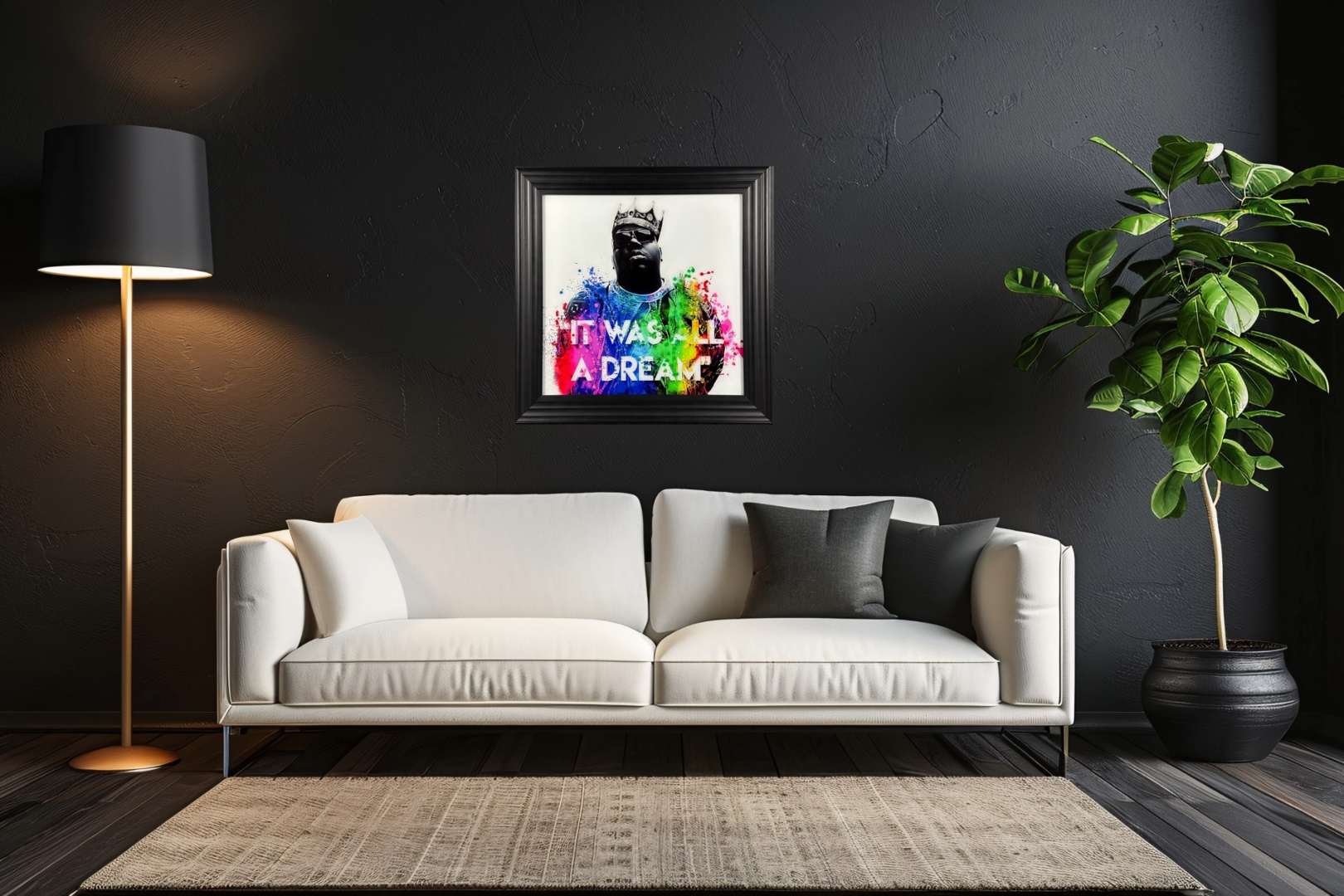 A black framed liquid art picture titled It Was All A Dream, featuring Notorious B.I.G., stands as a powerful homage to the legendary rapper's iconic legacy. Measuring 86cm in both height and width, this artwork captures the essence of Biggie Smalls with a blend of artistic prowess and cultural reverence.