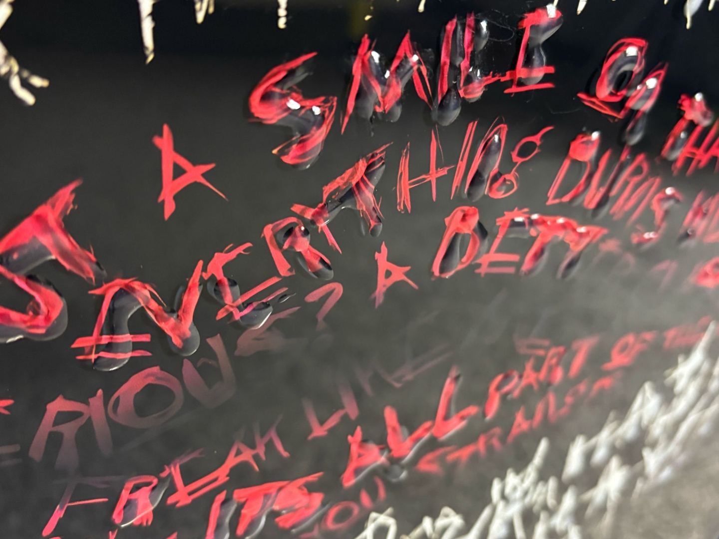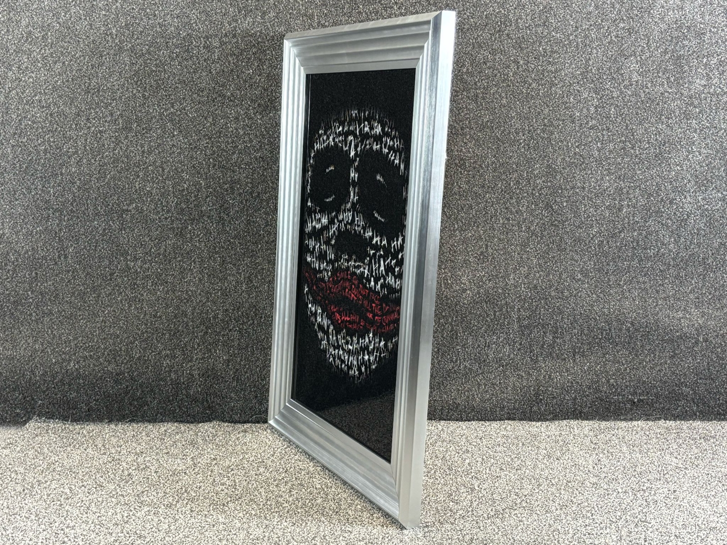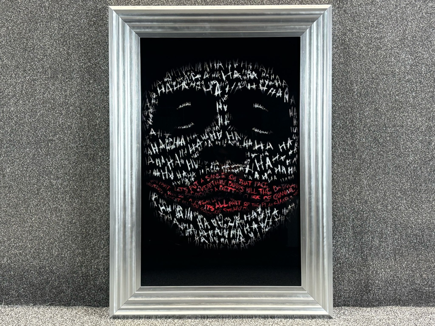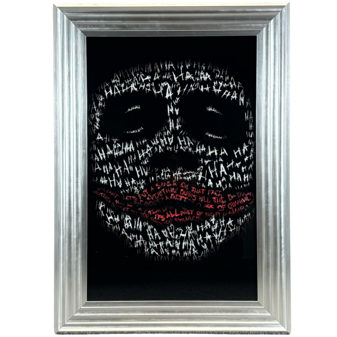 A brand new silver-framed liquid art picture of The Joker—one of pop culture’s most iconic and enigmatic villains. Measuring 102cm in height and 72cm in width, this gripping artwork features a haunting portrayal of The Joker’s face formed entirely from layers of white “HA HA” text and blood-red quotes that shape his sinister grin. The design is brilliantly executed, merging typography with imagery to create a chilling, immersive visual experience.