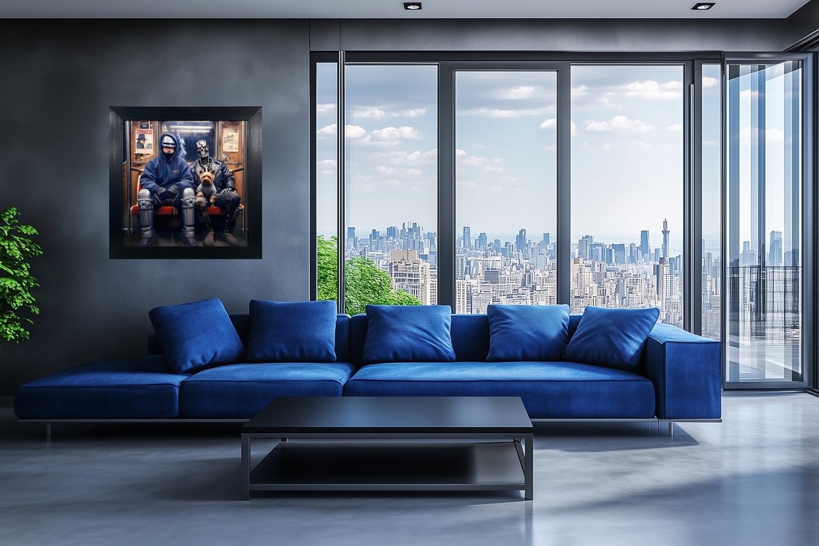 A black framed liquid art picture presents an imaginative and humorous depiction of two iconic sci-fi characters, The Terminator and Robocop, casually sitting side by side on a subway train. The scene is further enlivened by the addition of a small dog, perched comfortably on The Terminator's lap, creating an intriguing blend of the futuristic and the everyday. The detailed artwork captures the stoic nature of these two characters, juxtaposed against the mundane setting of public transportation, all while hinting at the unspoken bond between them as they share a quiet moment in their journey.