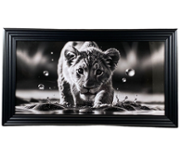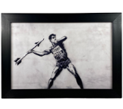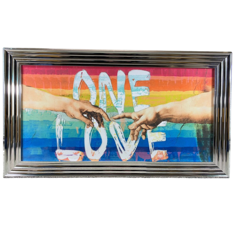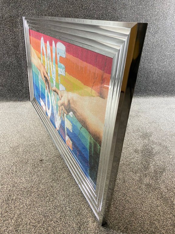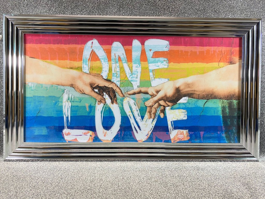 A chrome-framed liquid art picture titled "One Love." Measuring 26 inches in height and 46 inches in width, this striking artwork embodies the timeless message of unity and affection.