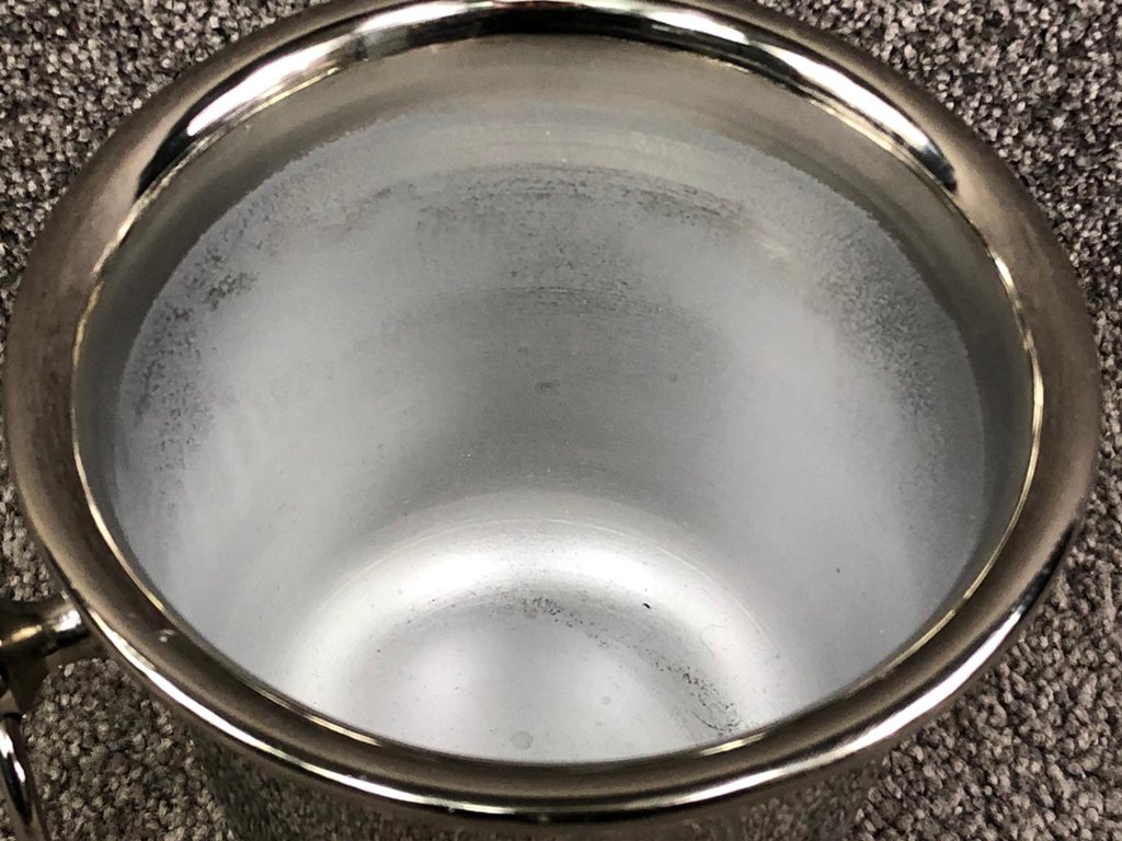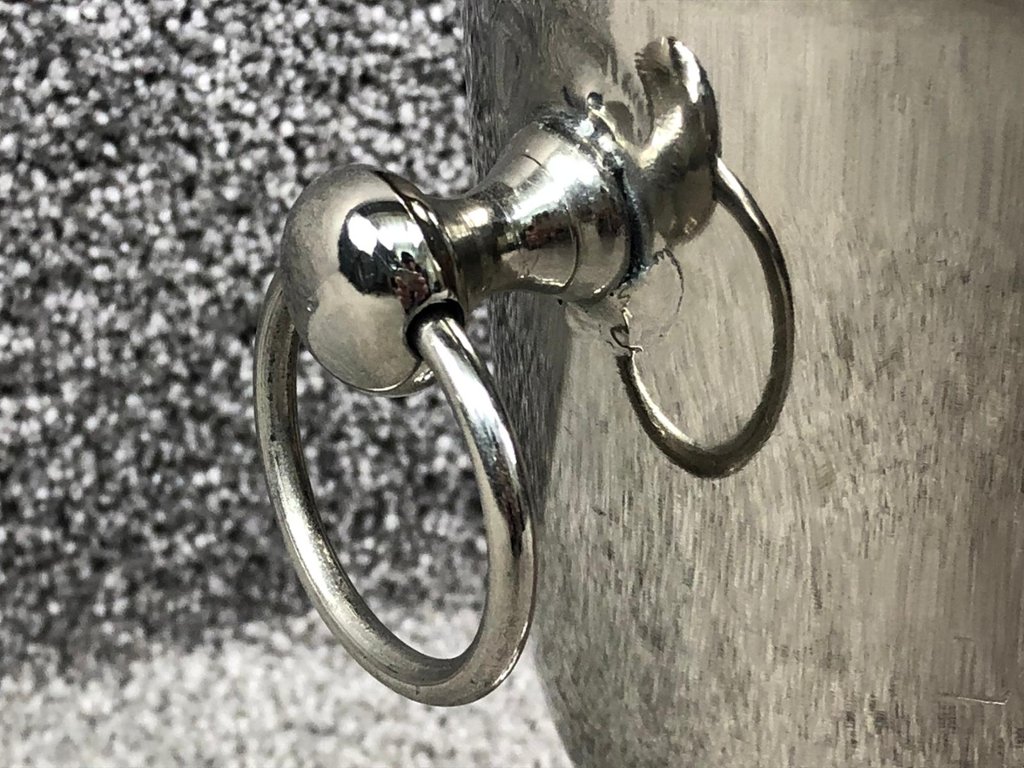 A chrome Louis Roederer double-handled champagne bucket, a symbol of elegance and sophistication. Standing at approximately 7 inches in height and boasting a width of 8 inches, this champagne bucket is a luxurious addition to any table setting.
