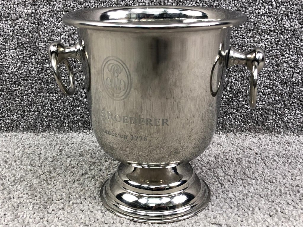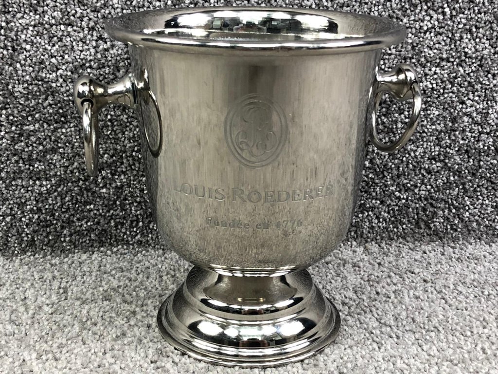 A chrome Louis Roederer double handled champagne bucket. Approx 7" height, 8" width.
