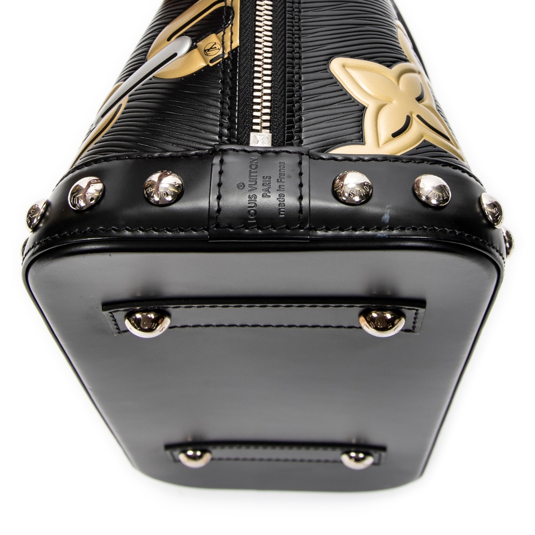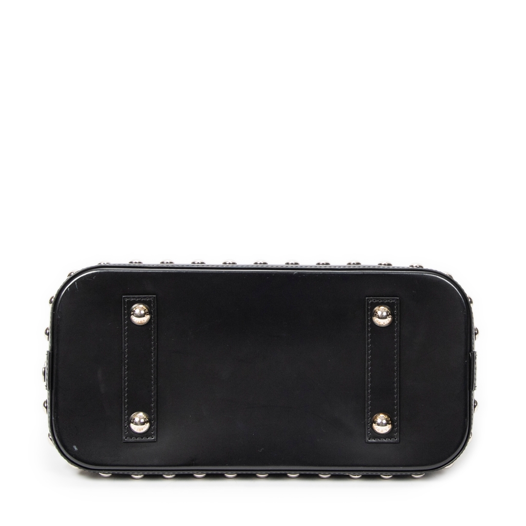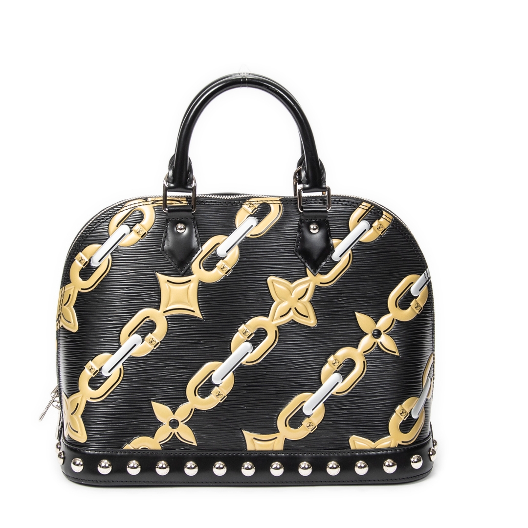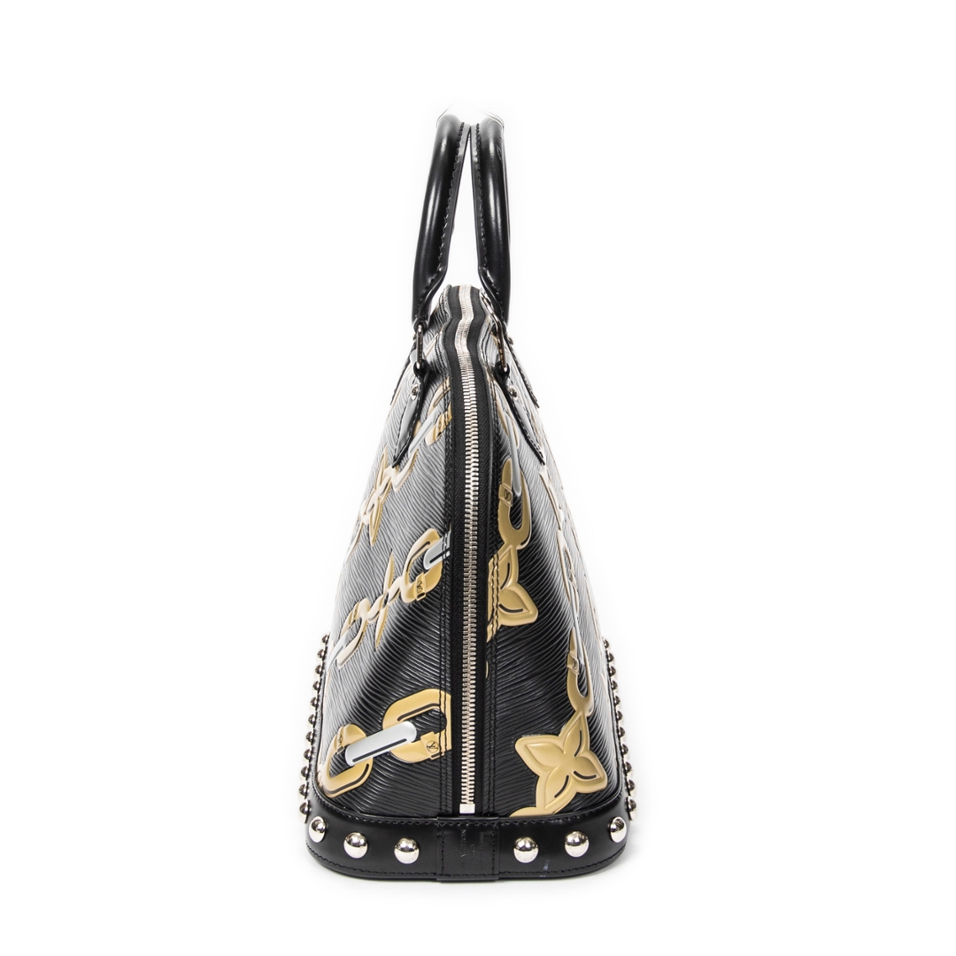 A vintage Louis Vuitton Alma bag crafted in striking black calf leather, elevated with bold gold-tone chain motif detailing that delivers a distinctive and contemporary interpretation of the house’s classic design. The textured leather exterior is complemented by structured top handles, silver-tone hardware accents, and stud detailing along the base, creating a confident and eye-catching statement piece.