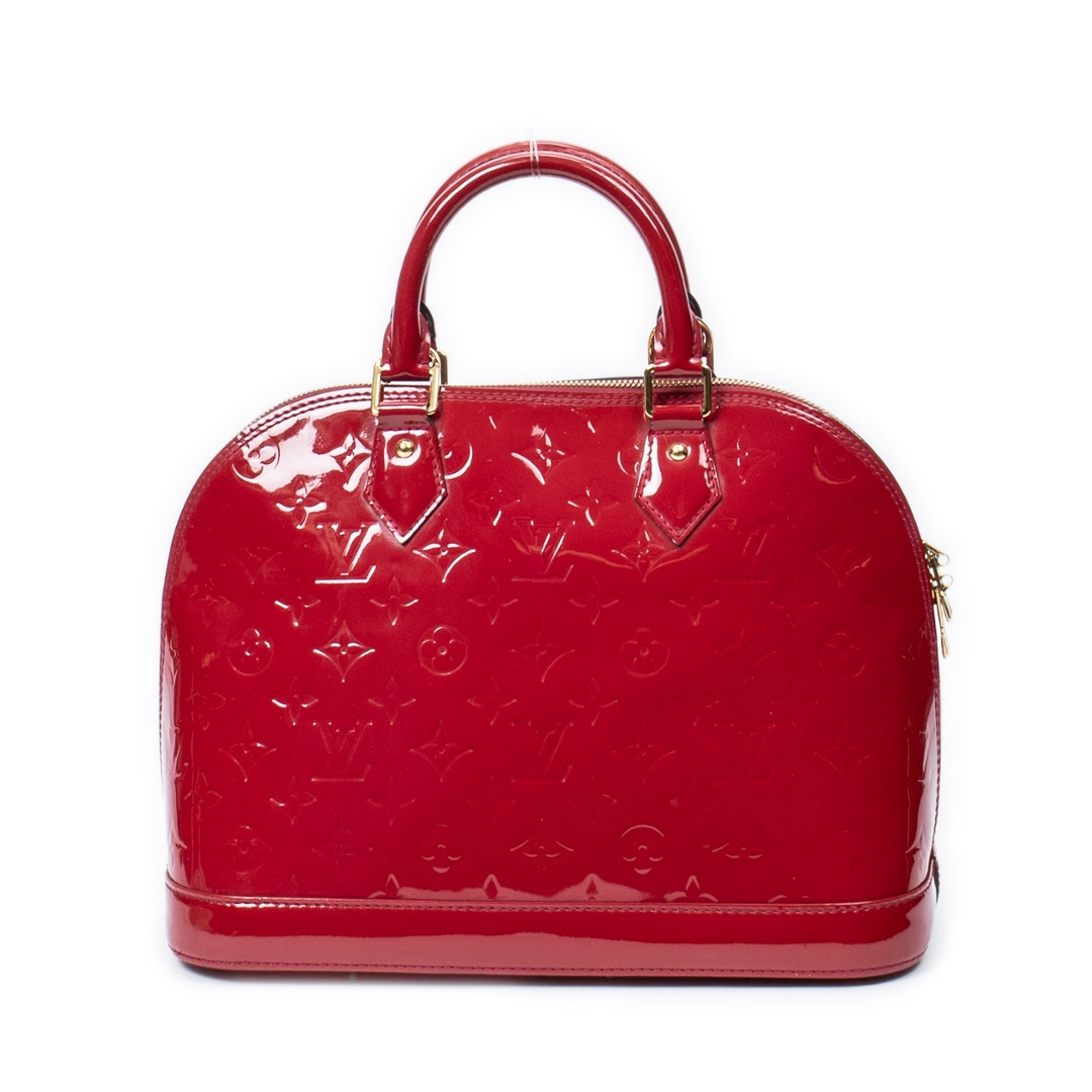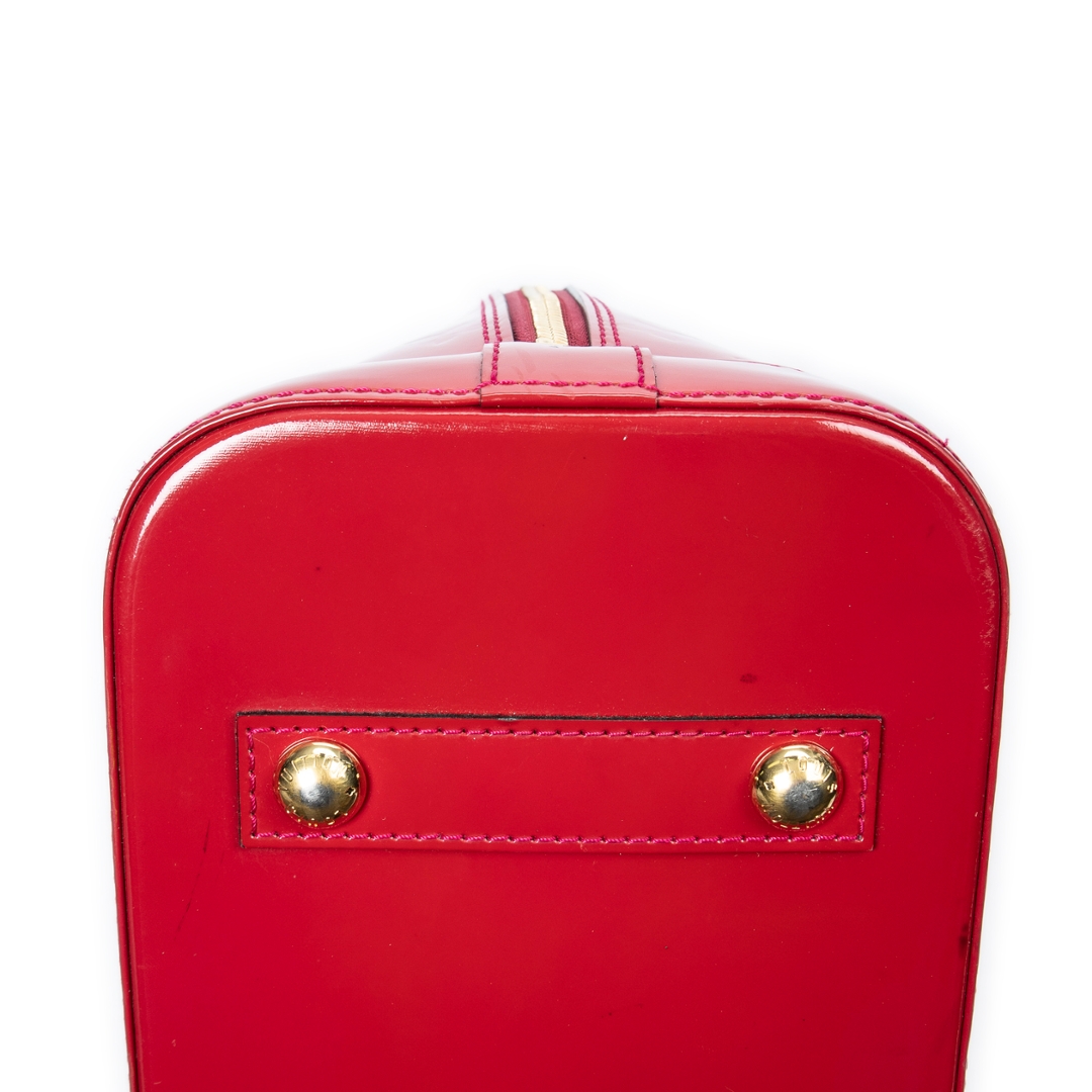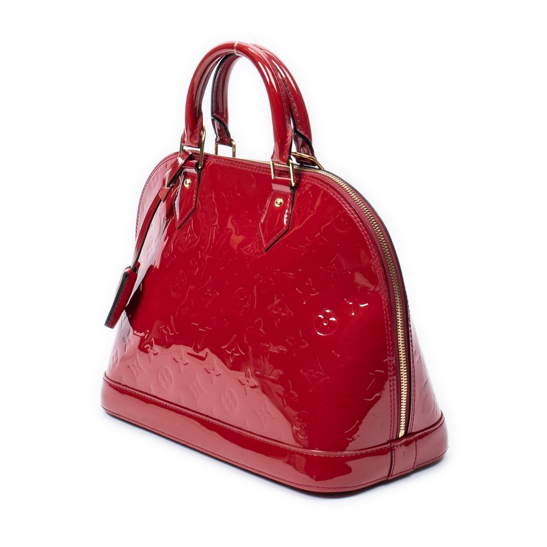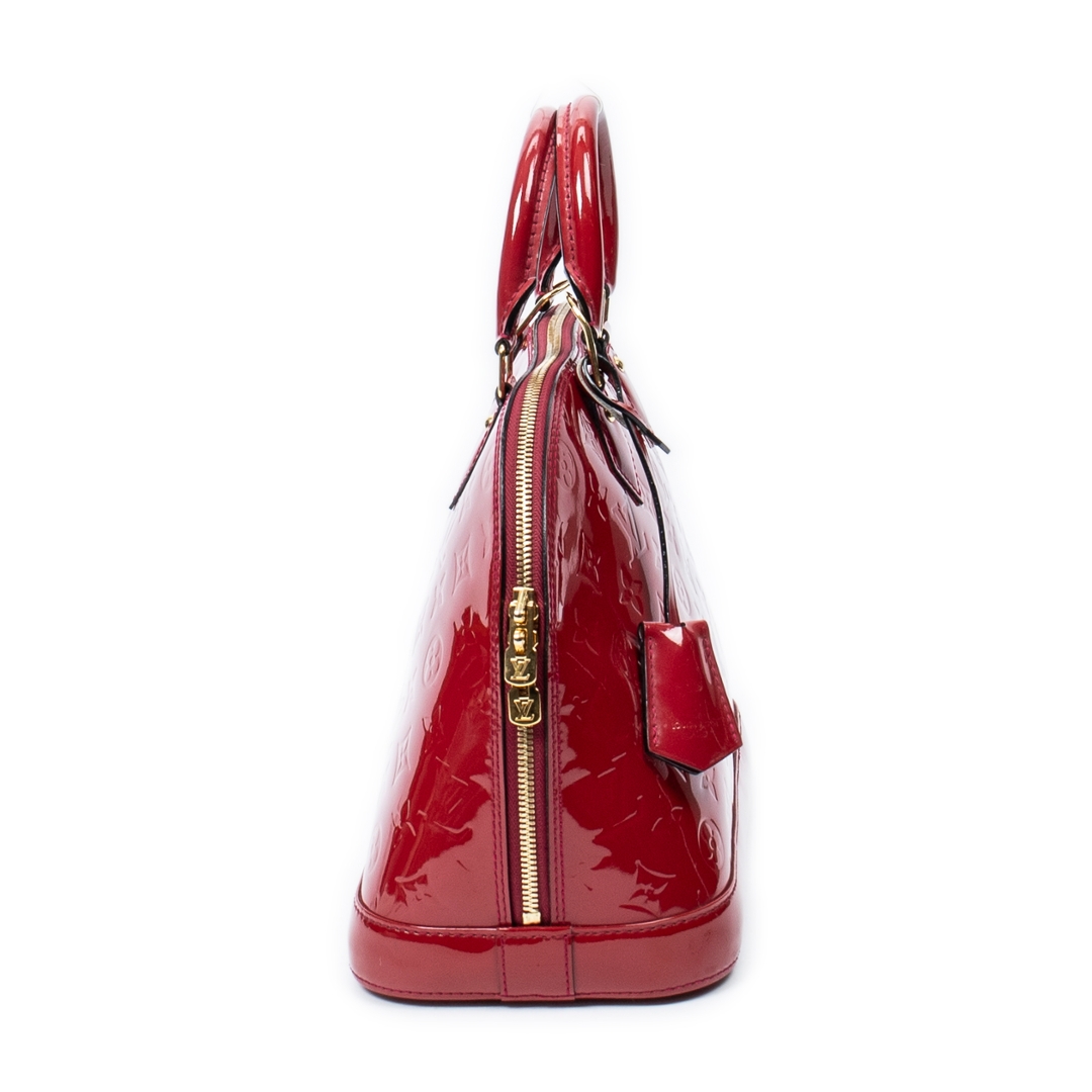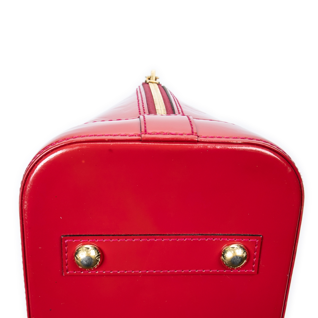 A vintage Louis Vuitton Alma bag crafted in striking Indian Rose Vernis calf leather, featuring a high-gloss finish embossed with the iconic monogram pattern. This elegant and feminine colourway enhances the classic domed silhouette, while gold-tone hardware and smooth leather detailing complete the refined, statement look.