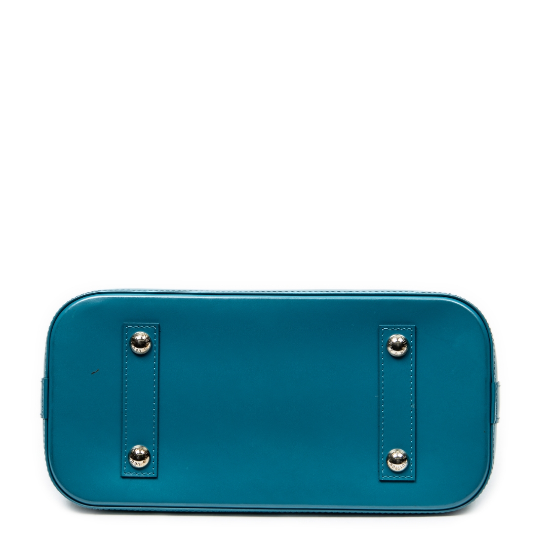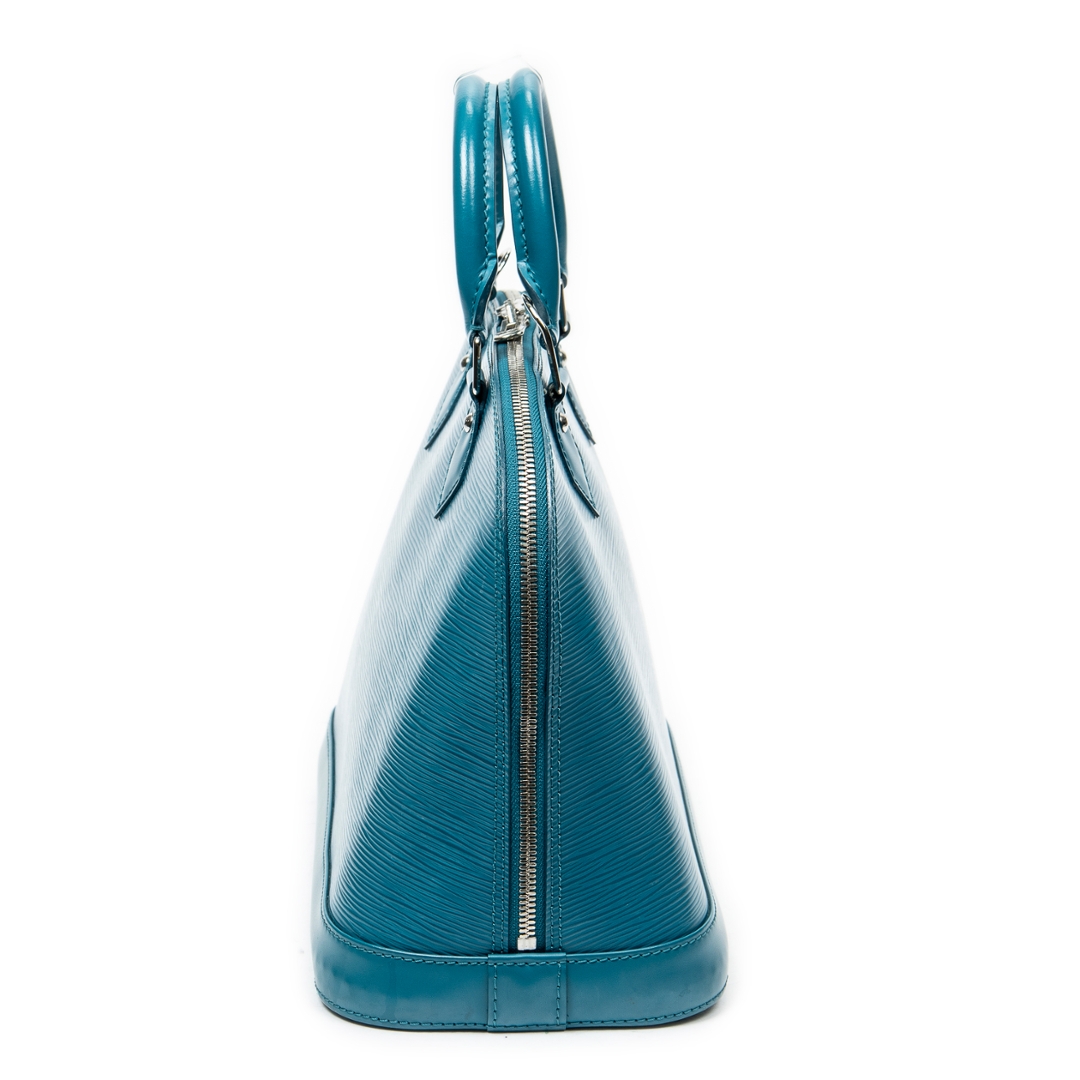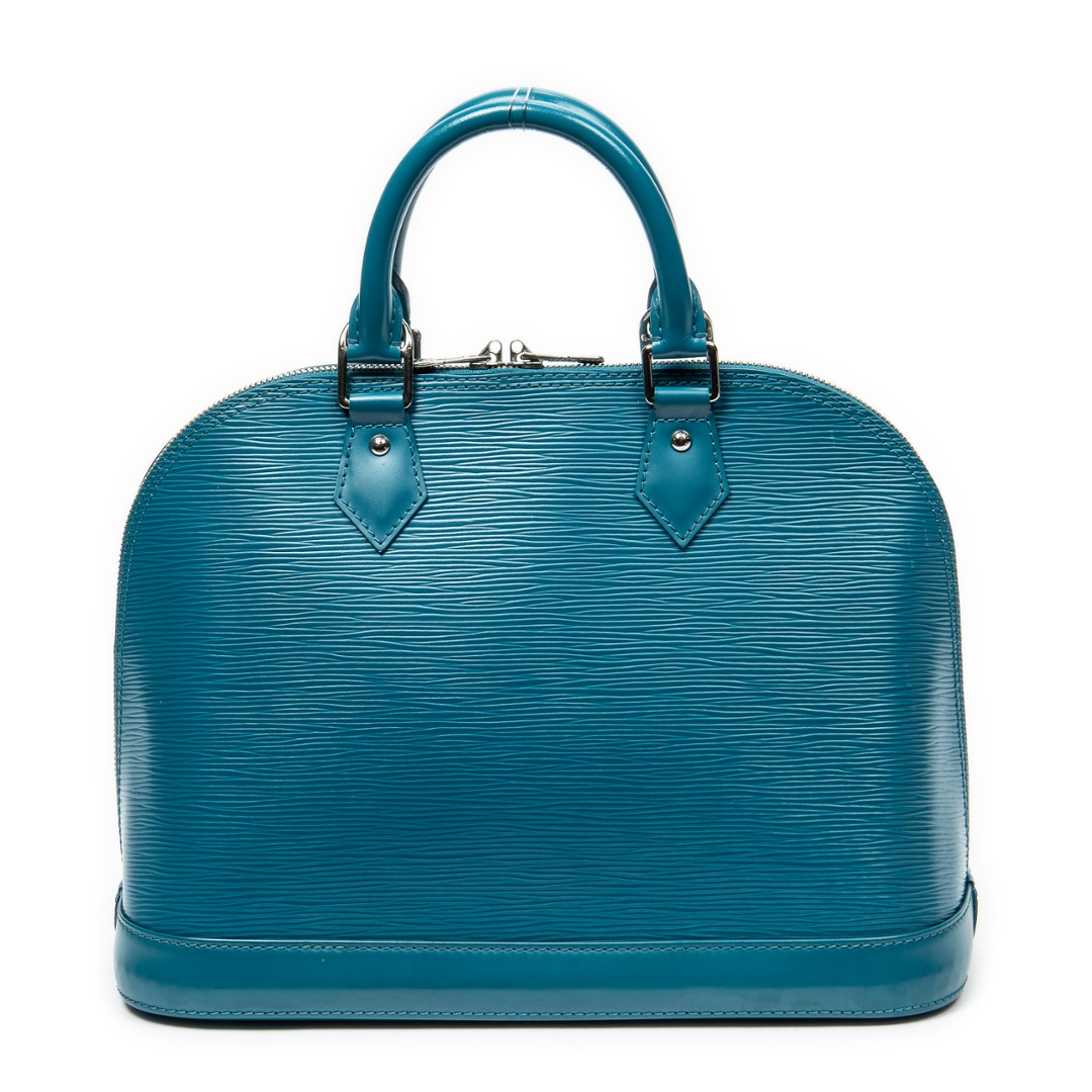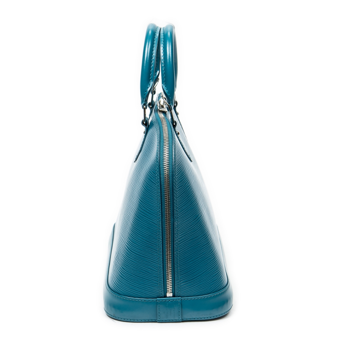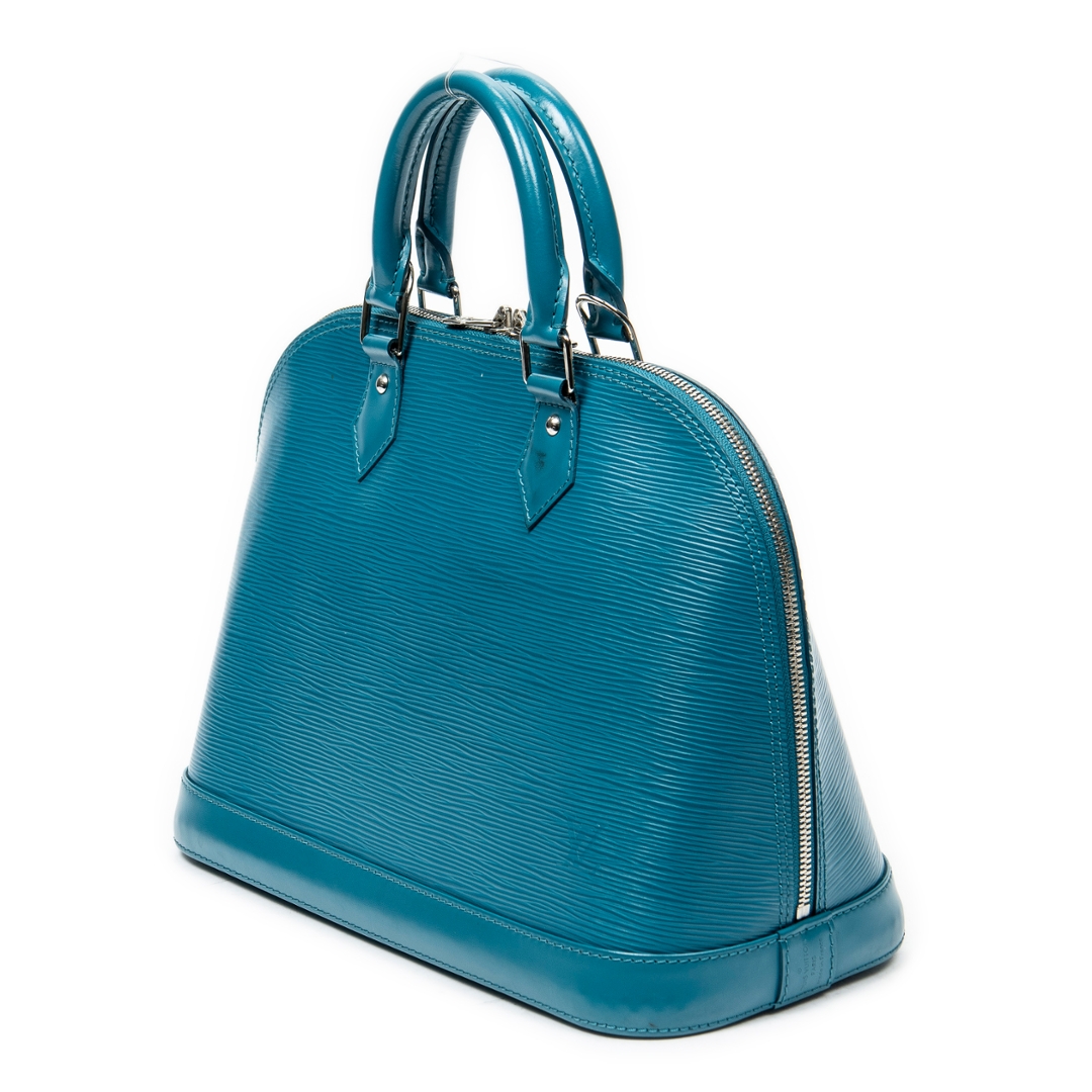 A vintage Louis Vuitton Alma bag crafted in striking turquoise calf leather, offering a bold and contemporary interpretation of the house’s iconic structured silhouette. The elegant dome-shaped design is enhanced by the distinctive textured finish, complemented by dual rolled top handles, silver-tone hardware, and a secure double zip closure. Measuring approximately 23cm in height and 30cm in width, it provides a well-balanced size suited to everyday use.