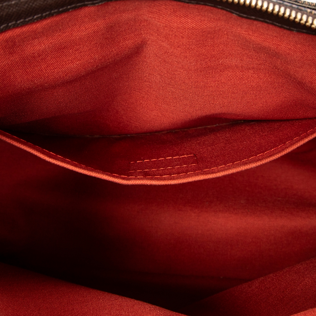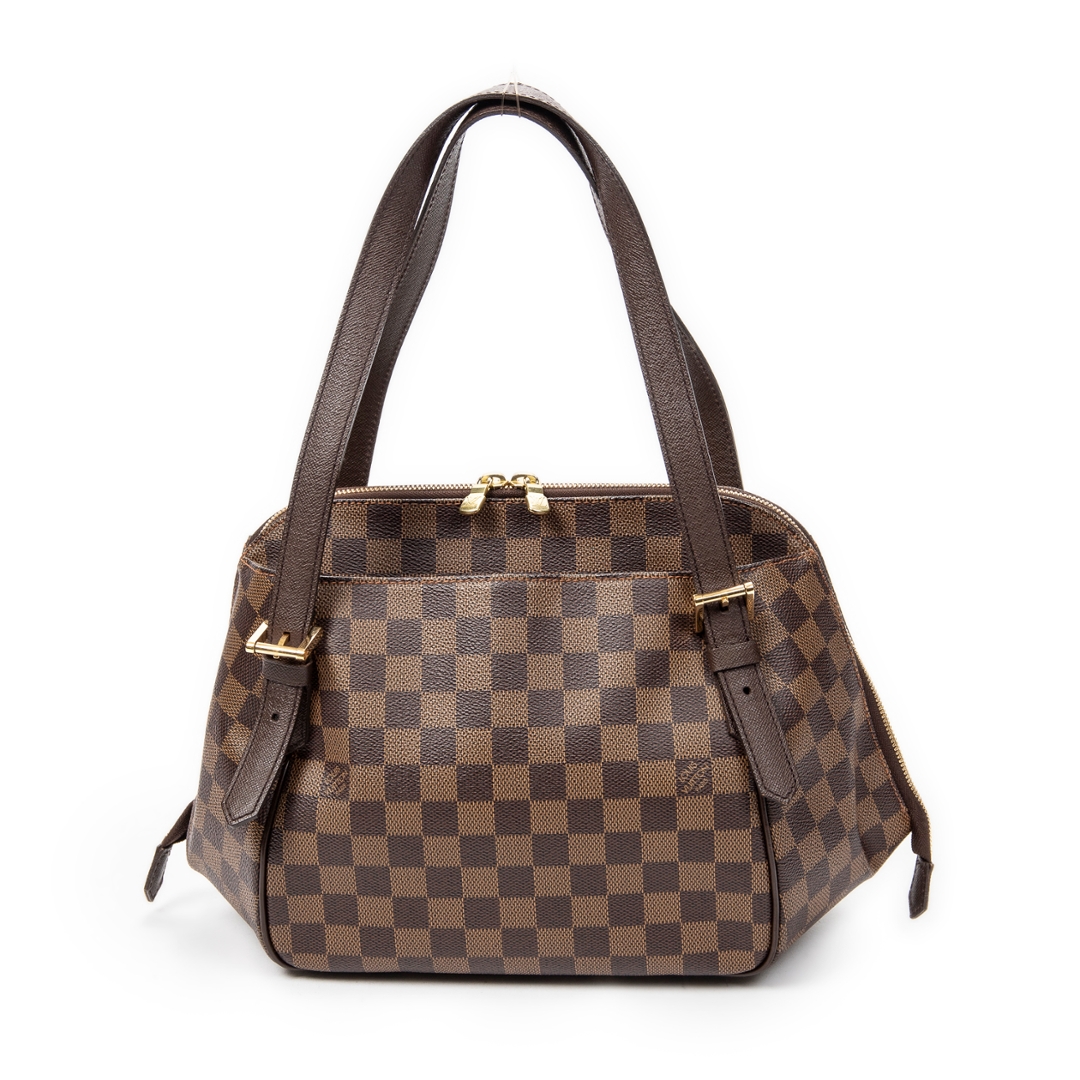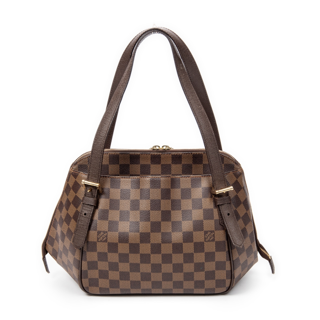 A vintage Louis Vuitton Belem bag crafted in the classic brown coated canvas with the iconic Damier Ebene pattern, complemented by dark leather trim and gold-tone hardware. The structured silhouette is defined by its clean lines and double top handles, while the full-length zip closure provides both security and a refined finish.