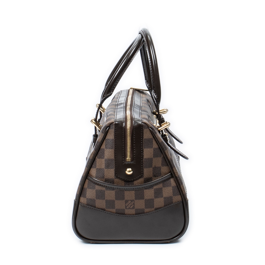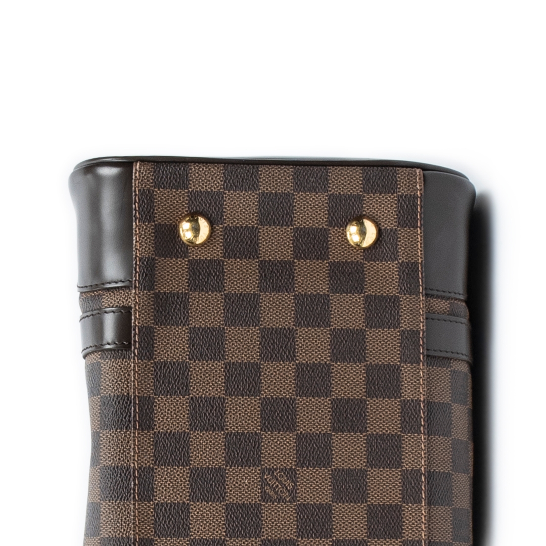 A vintage Louis Vuitton Berkeley bag crafted in the signature brown coated canvas with the iconic Damier Ebene pattern, elevated by smooth dark leather trim and gold-tone hardware. The structured silhouette is defined by its elegant top handles and distinctive front plaque, creating a refined and instantly recognisable Louis Vuitton aesthetic.