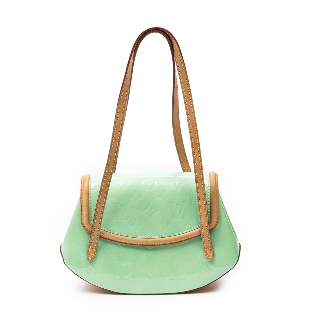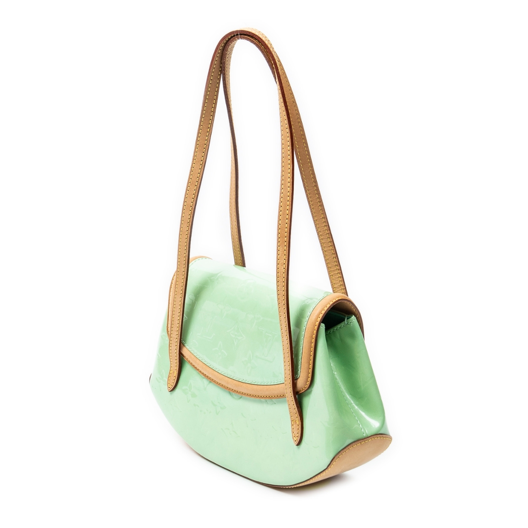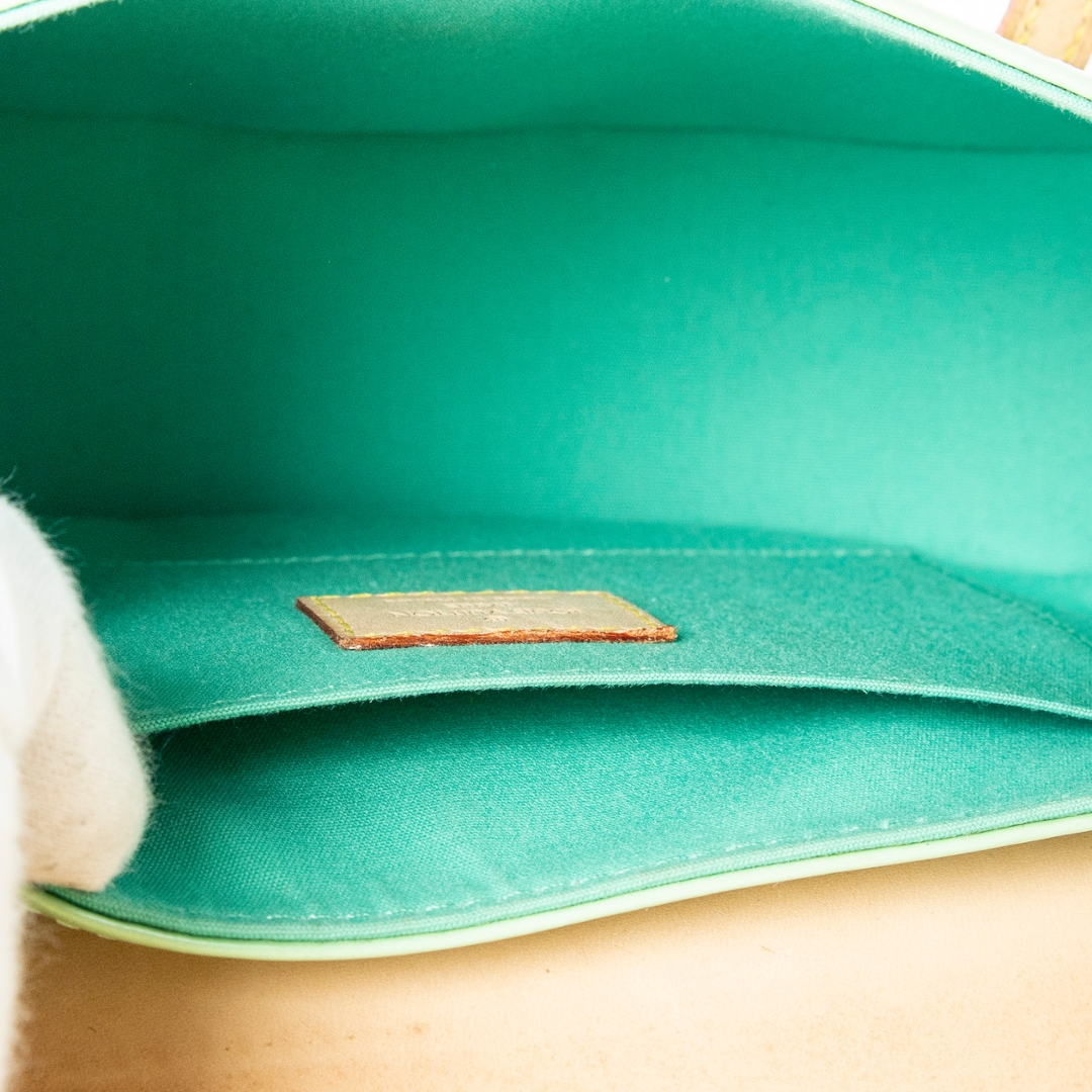 A vintage Louis Vuitton Biscayne Bay bag crafted in striking mint green calf leather, featuring the embossed monogram finish that delivers a refined yet contemporary aesthetic. The softly structured silhouette is complemented by natural leather trim and long shoulder straps, creating a distinctive and elegant profile that stands out within the Louis Vuitton collection.