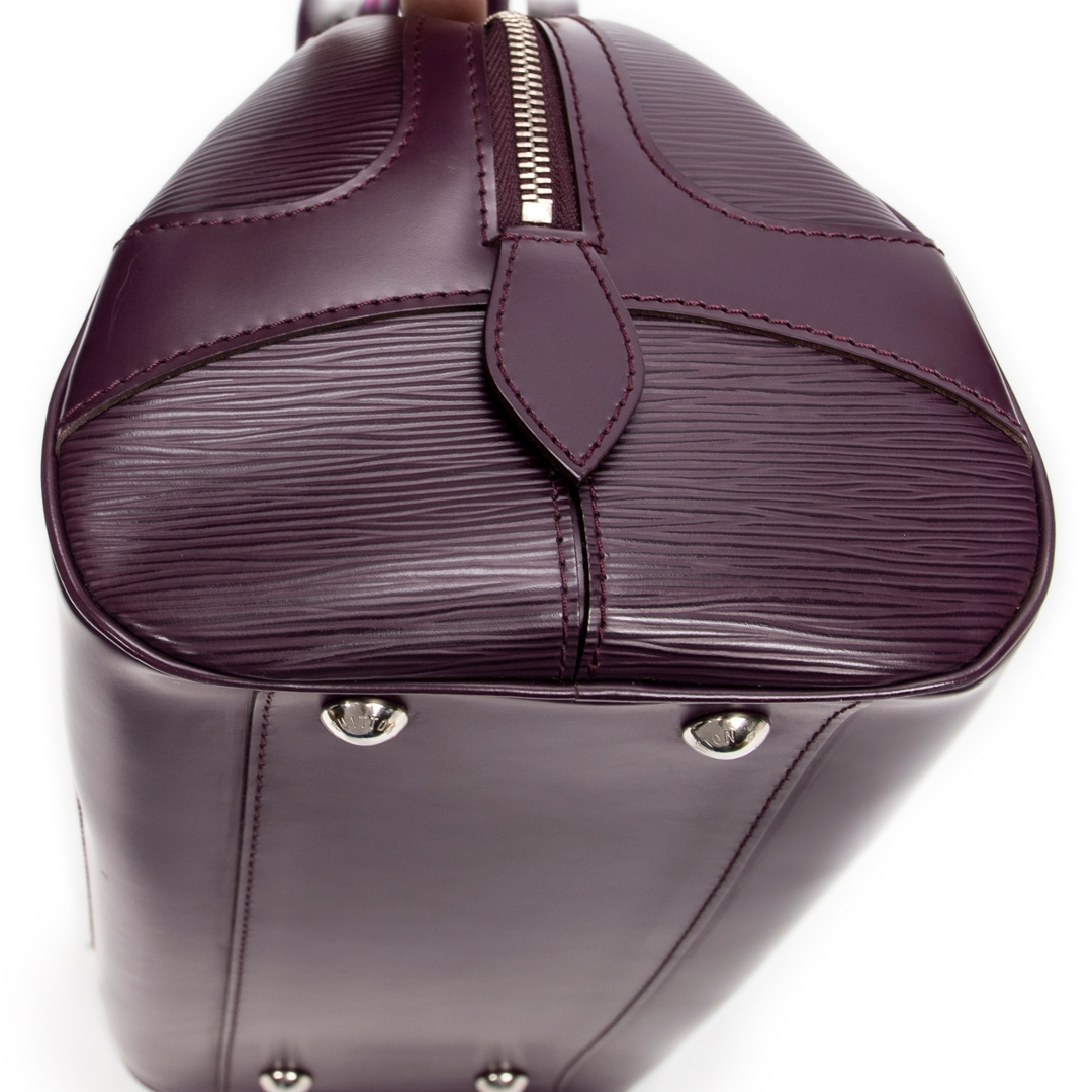 A vintage Louis Vuitton purple magenta calf leather Bowling Montaigne bag with a certificate of authenticity. Approximately 20cm height, 32cm width.