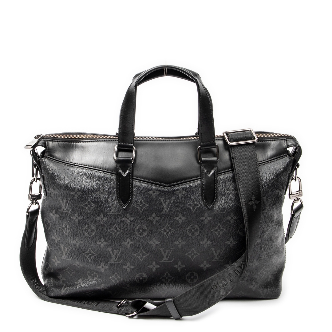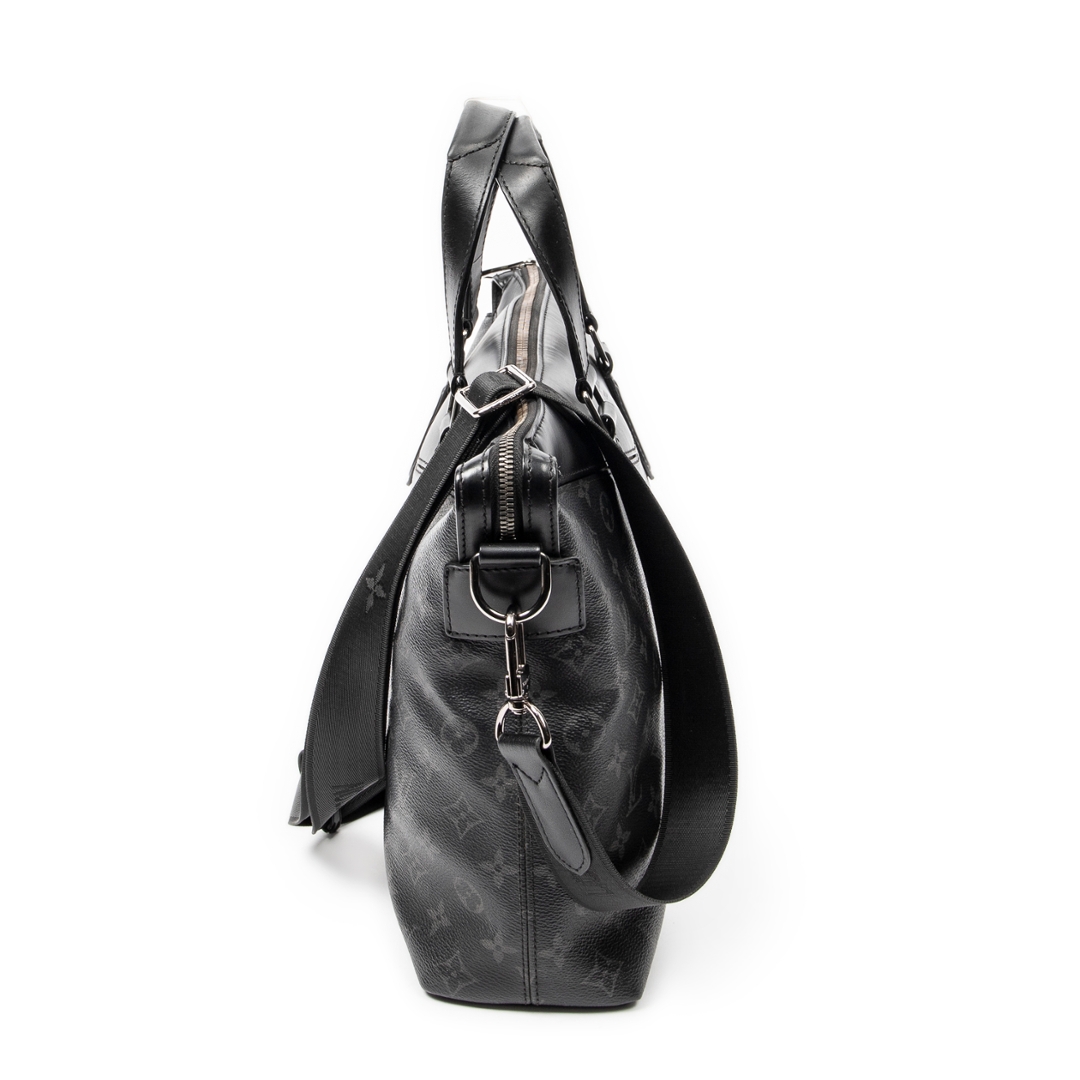 A vintage Louis Vuitton Briefcase Explorer bag crafted in black and grey coated canvas, featuring the subtle Monogram Eclipse pattern for a modern and understated luxury aesthetic. The structured design is complemented by smooth black leather trim, silver-tone hardware, and reinforced top handles, delivering both durability and a refined professional look.