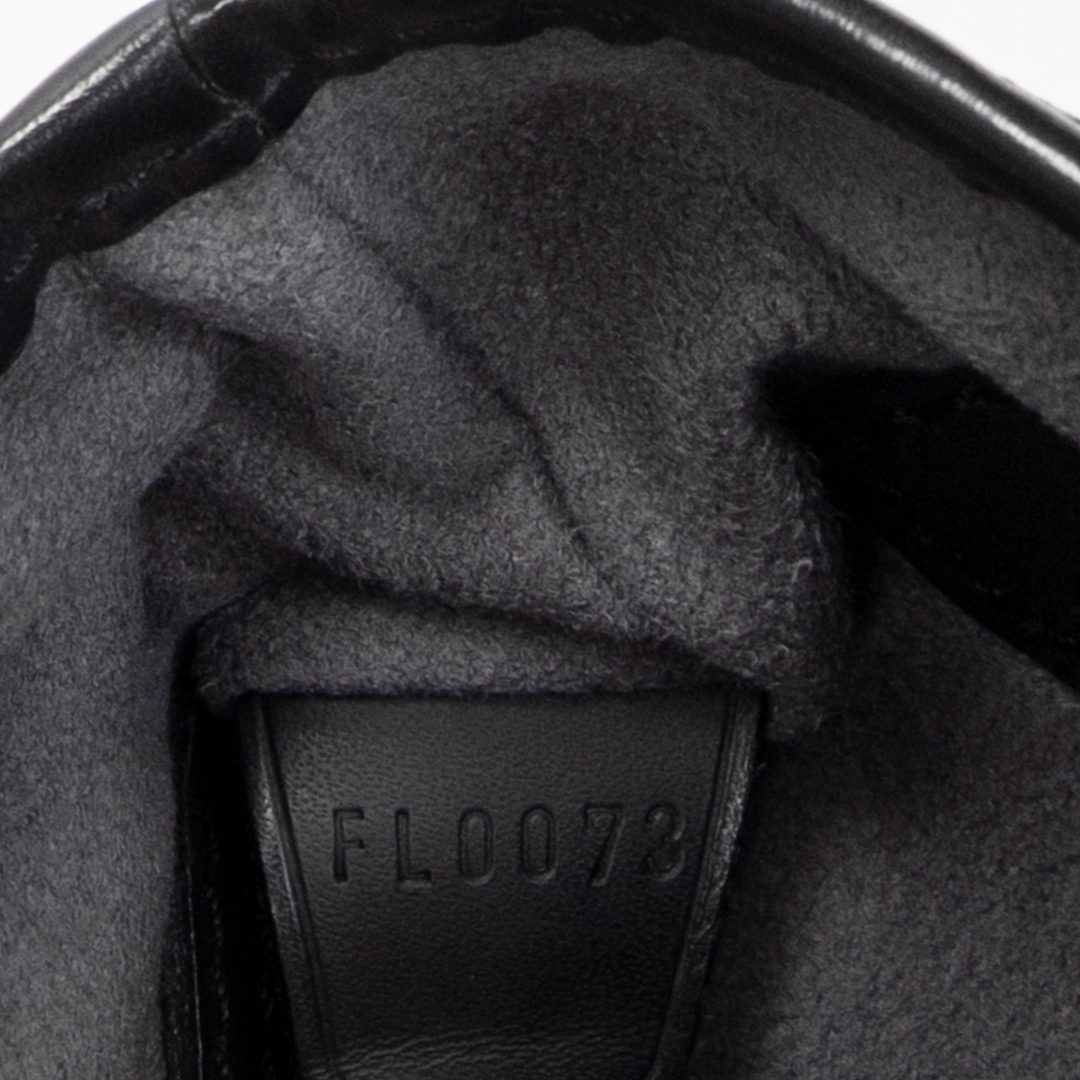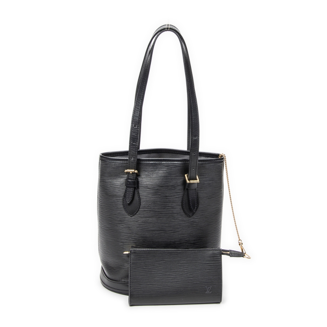 A vintage Louis Vuitton Bucket bag crafted in black calf leather, offering a refined and understated take on the house’s classic cylindrical silhouette. The structured design is complemented by dual adjustable shoulder straps, subtle gold-tone hardware, and a matching detachable pouch secured with a delicate chain. Measuring approximately 26cm in height and 23cm in width, it presents a compact yet practical size suited to everyday use.