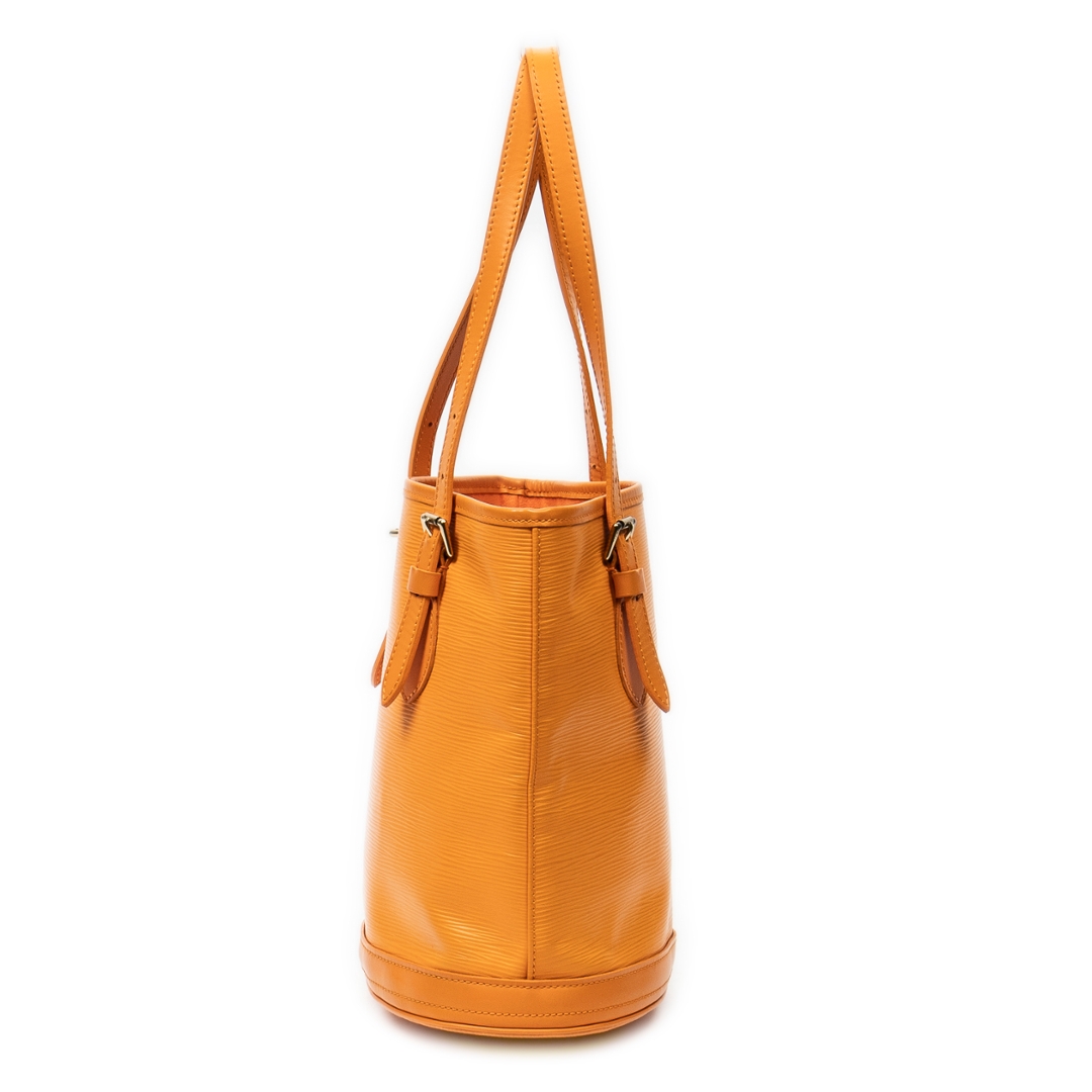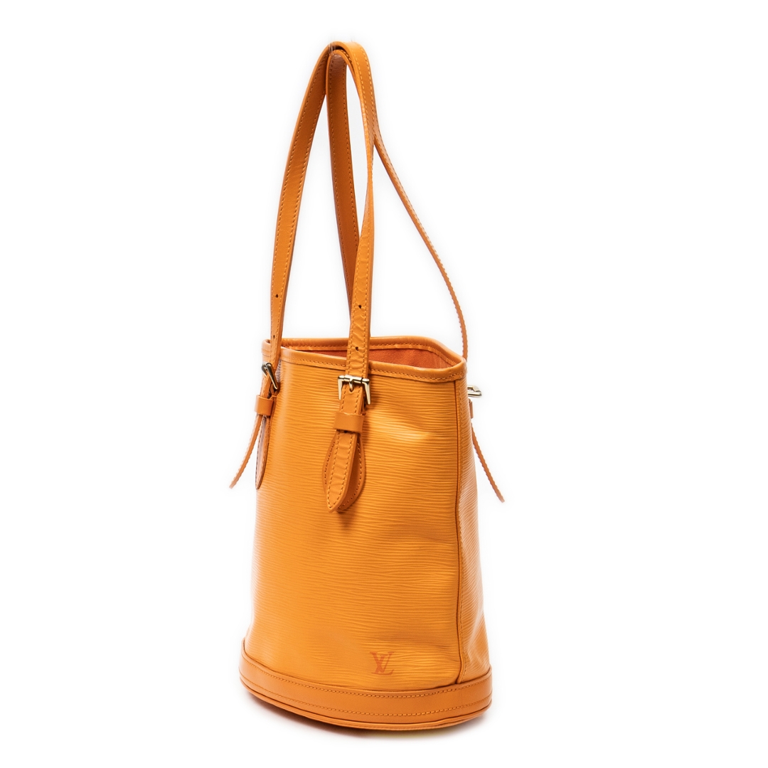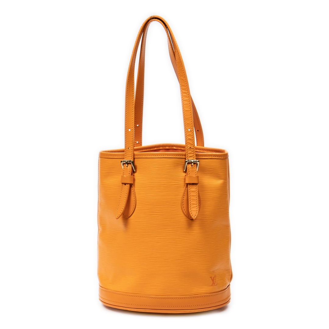 A vintage Louis Vuitton Mandarin Orange Calf Leather Bucket bag with a certificate of authenticity. Approximately 25cm height, 23cm width.