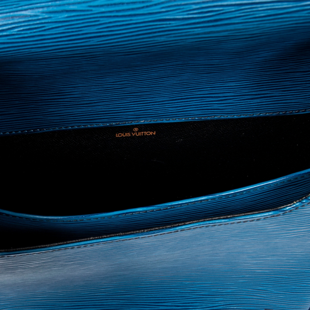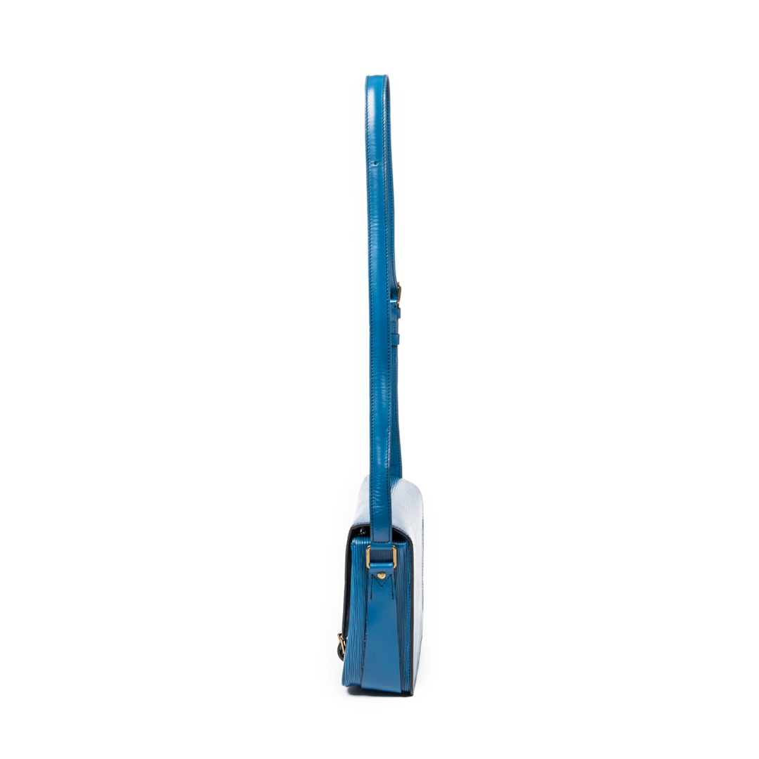 A vintage Louis Vuitton Cartouchière bag crafted in striking blue calf leather, offering a compact and structured silhouette with a distinctive refined edge. The design features a front flap with a buckle fastening, accented by contrasting black stitching that highlights its clean lines and craftsmanship. An adjustable shoulder strap and gold-tone hardware complete the piece, while its dimensions of approximately 20cm in height and 22cm in width make it ideal for carrying everyday essentials.