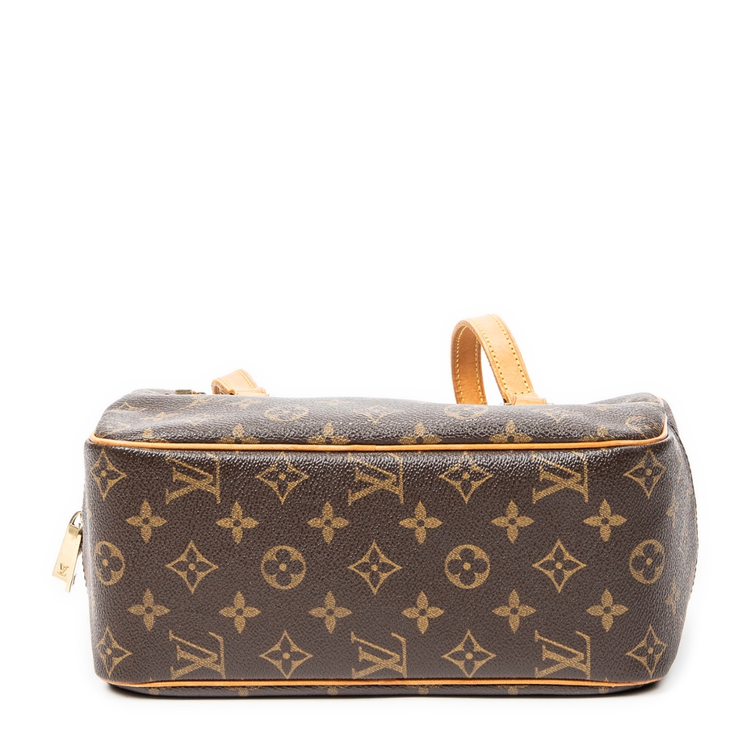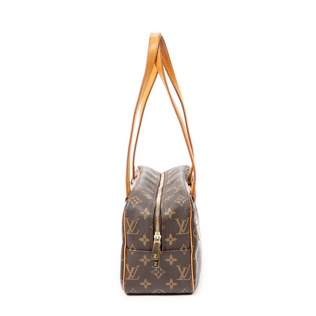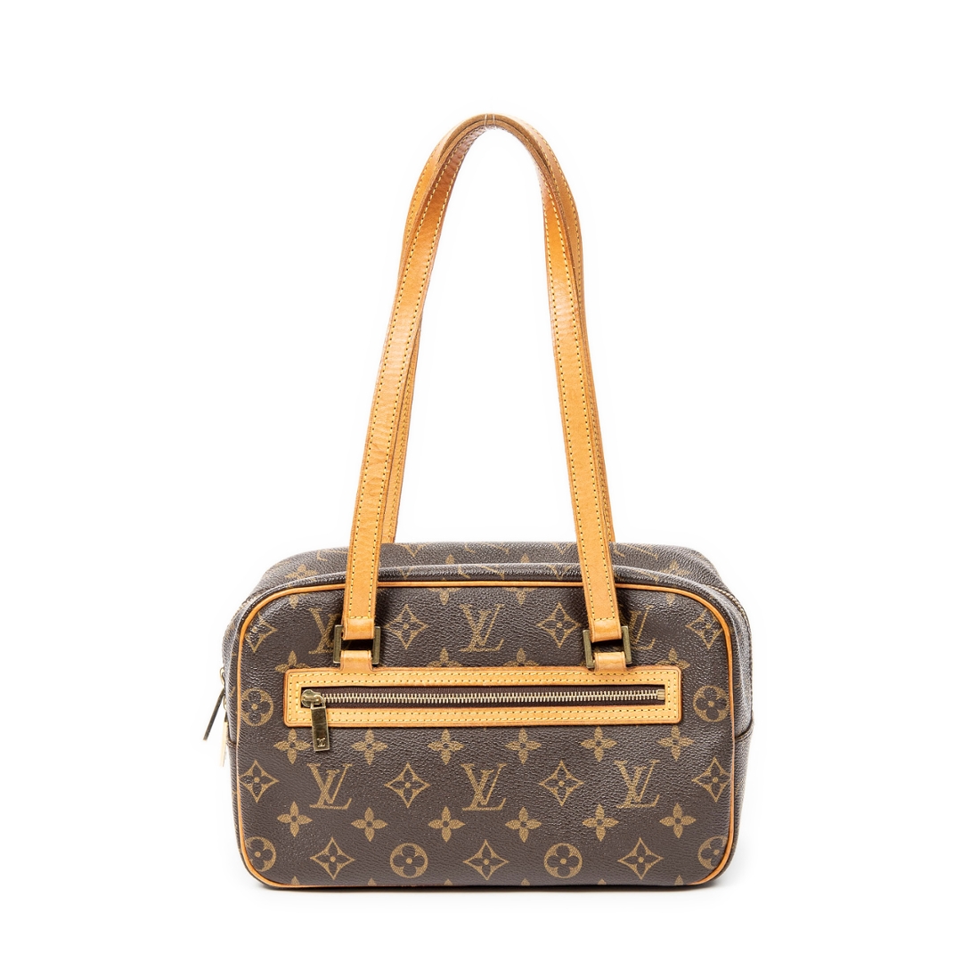 A vintage Louis Vuitton Cite bag crafted in the iconic brown Monogram coated canvas, presented in a more compact and structured silhouette ideal for refined everyday use. The streamlined rectangular shape is paired with long natural leather shoulder straps, allowing for a comfortable and elegant carry, while the front zipped pocket adds both functionality and signature detailing. Measuring approximately 16cm in height and 24cm in width, this smaller format offers a neat and versatile profile.