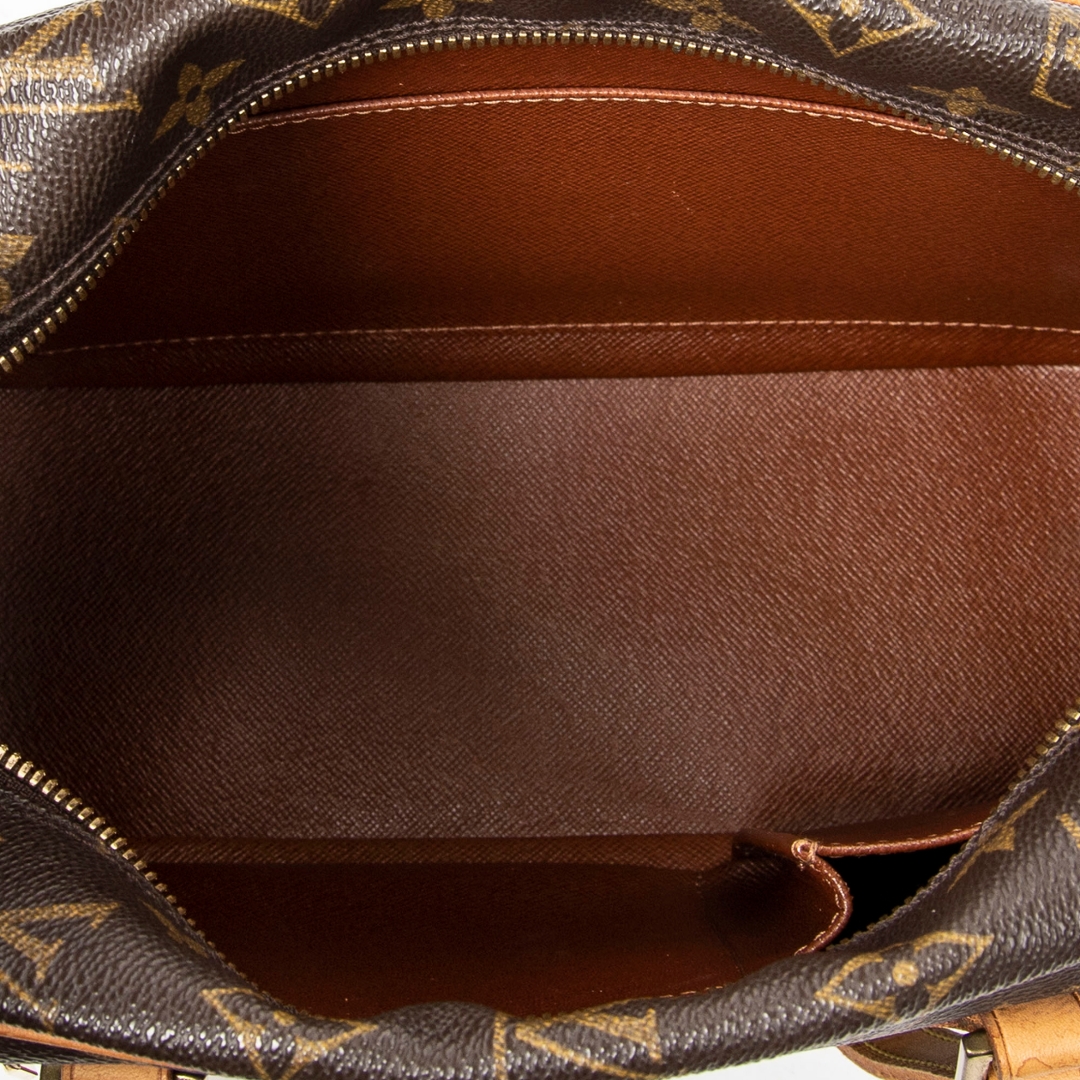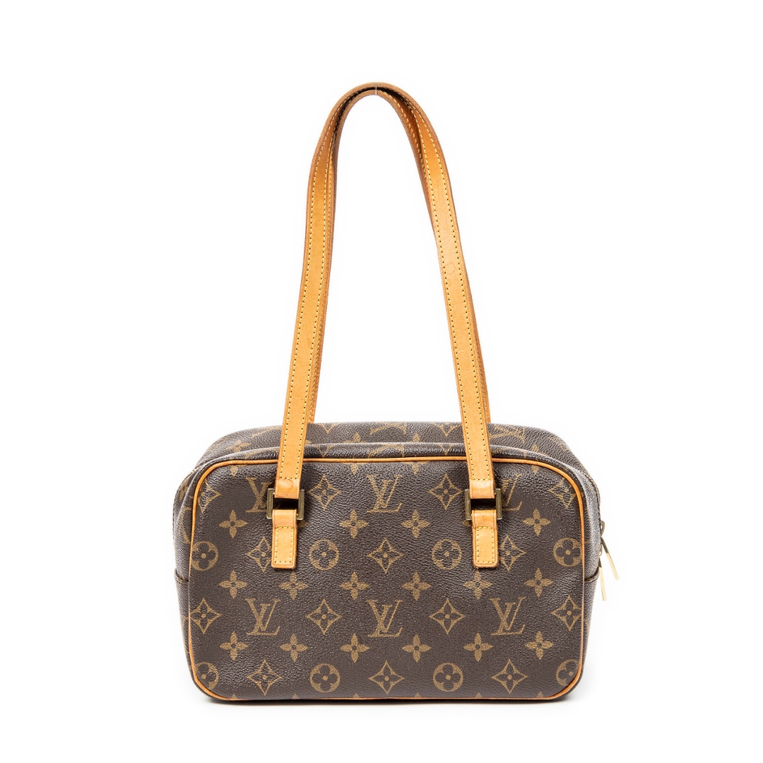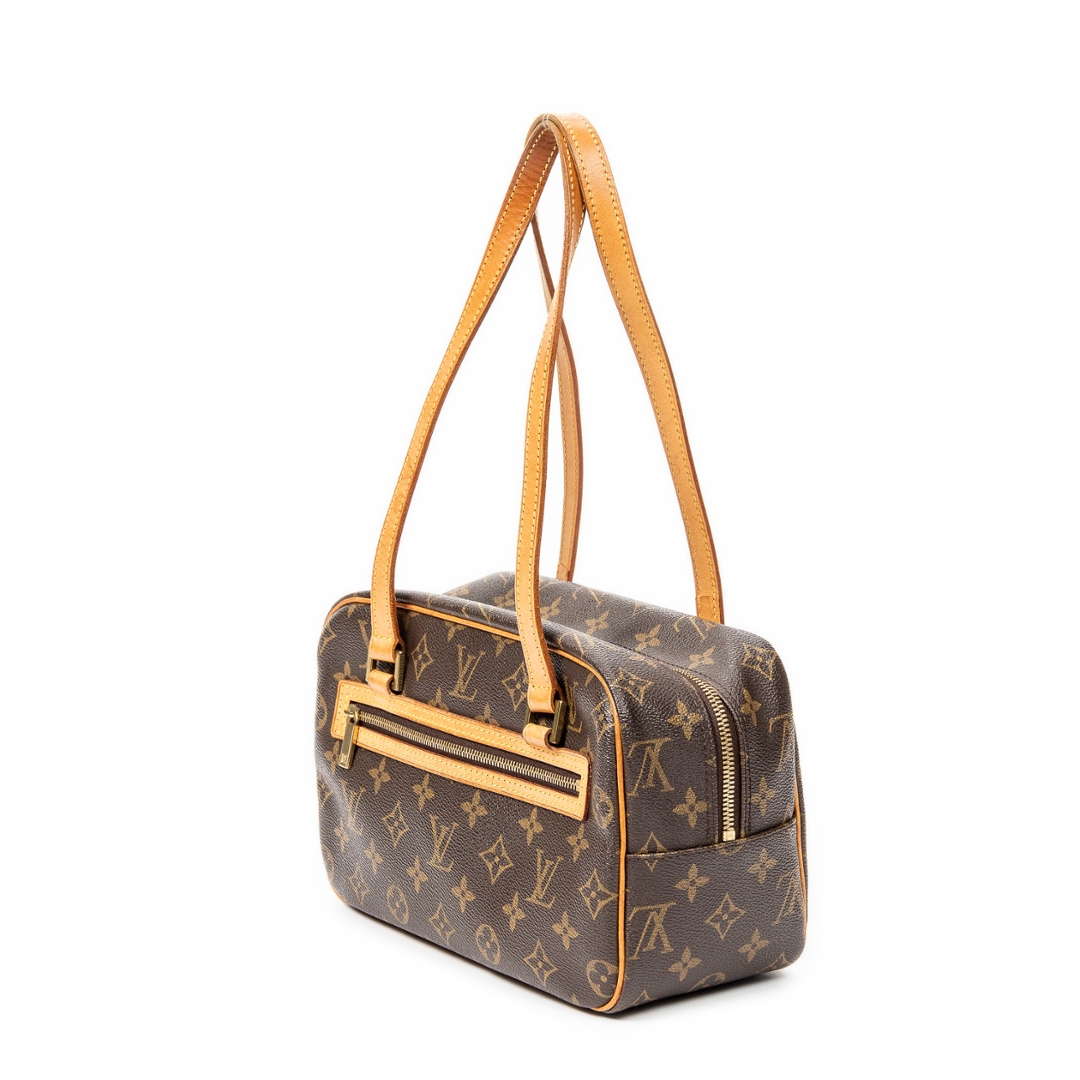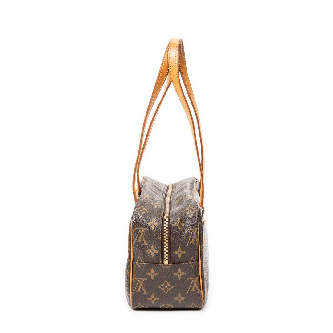 A vintage Louis Vuitton Cite bag crafted in the iconic brown Monogram coated canvas, presented in a more compact and structured silhouette ideal for refined everyday use. The streamlined rectangular shape is paired with long natural leather shoulder straps, allowing for a comfortable and elegant carry, while the front zipped pocket adds both functionality and signature detailing. Measuring approximately 16cm in height and 24cm in width, this smaller format offers a neat and versatile profile.