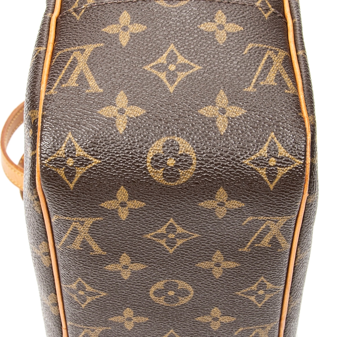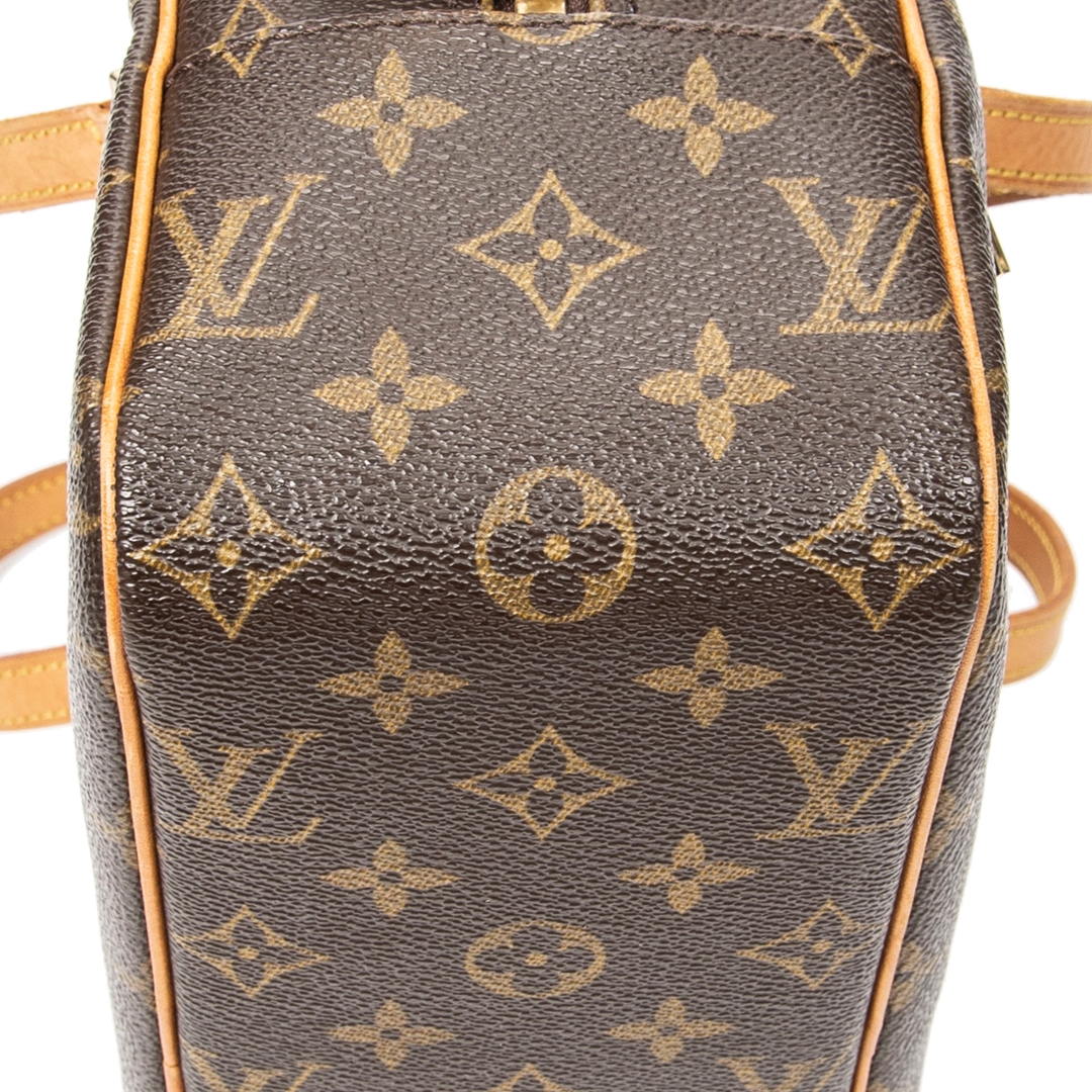 The coated canvas exterior is complemented by classic vachetta leather trim and gold-tone hardware, delivering a timeless Louis Vuitton aesthetic. A zip-top closure secures the interior, perfectly sized for daily essentials, while the external zip compartment provides convenient additional storage. Its clean proportions make it an effortless choice for both day and evening wear.