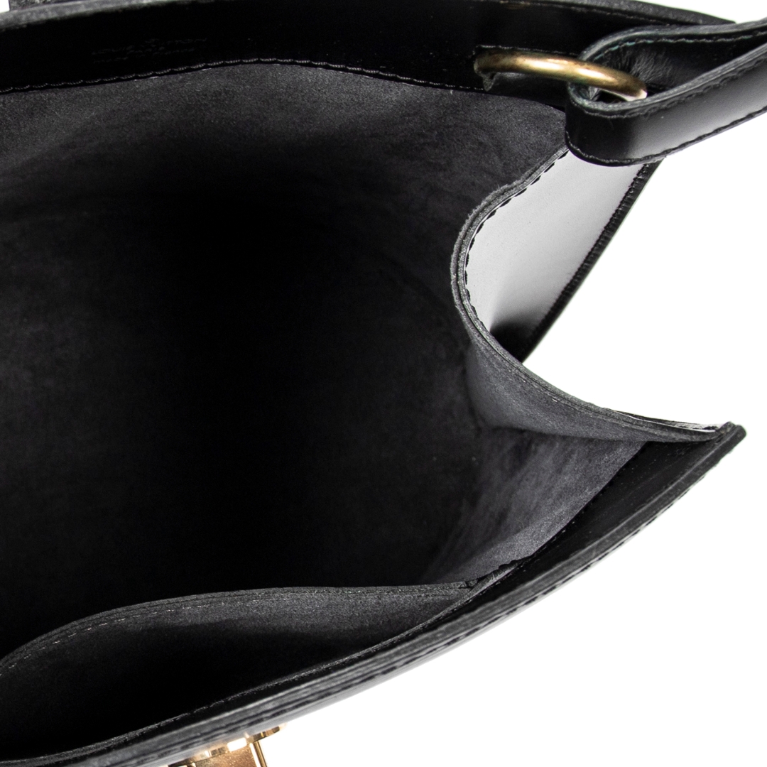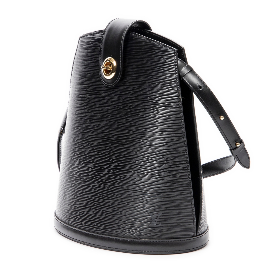 A vintage Louis Vuitton Cluny bag crafted from black calf leather, featuring the brand’s signature textured finish and a structured bucket-style silhouette. The elegant design is complemented by a distinctive top flap with a gold-tone turn-lock closure, creating a refined and timeless aesthetic suited to both day and evening wear.