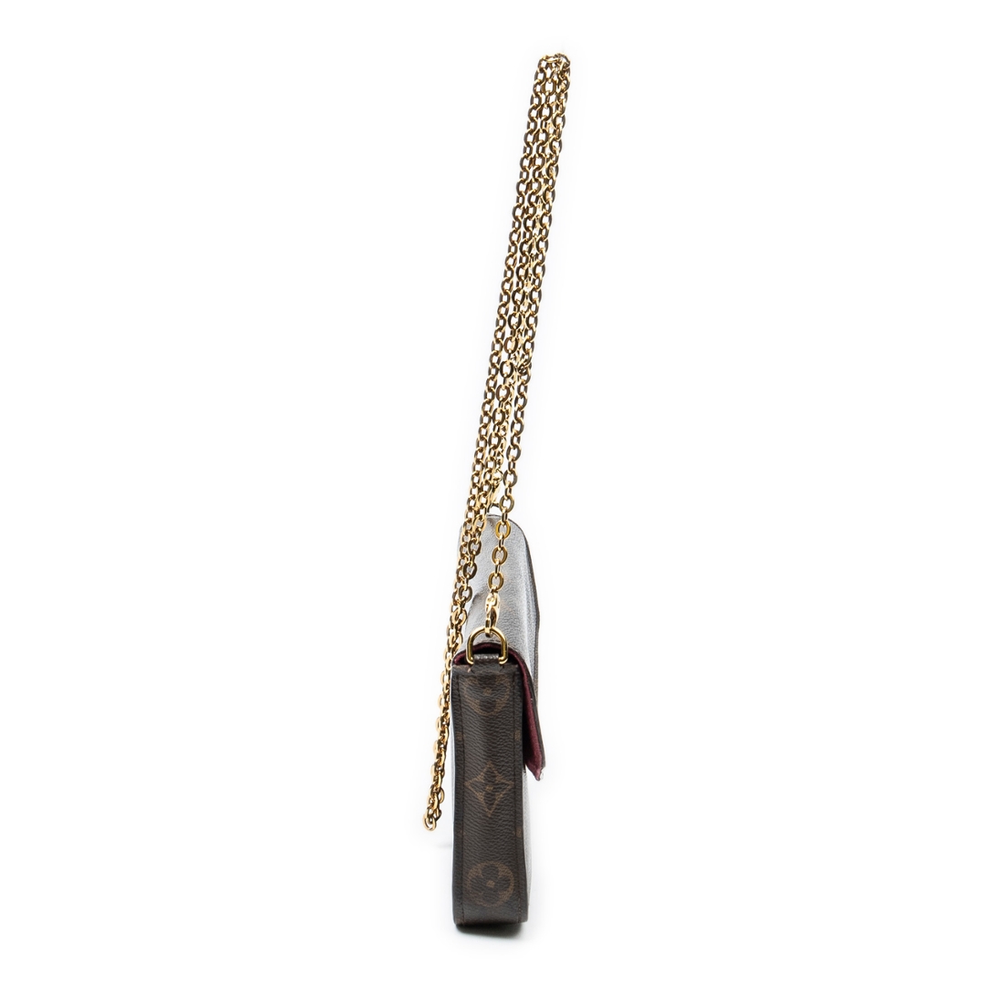 A vintage Louis Vuitton Félicie Pochette bag crafted in the iconic brown coated canvas, showcasing the signature monogram pattern with a sleek envelope-style silhouette. Finished with gold-tone hardware and a detachable chain strap, this refined piece offers both elegance and versatility within a compact design.