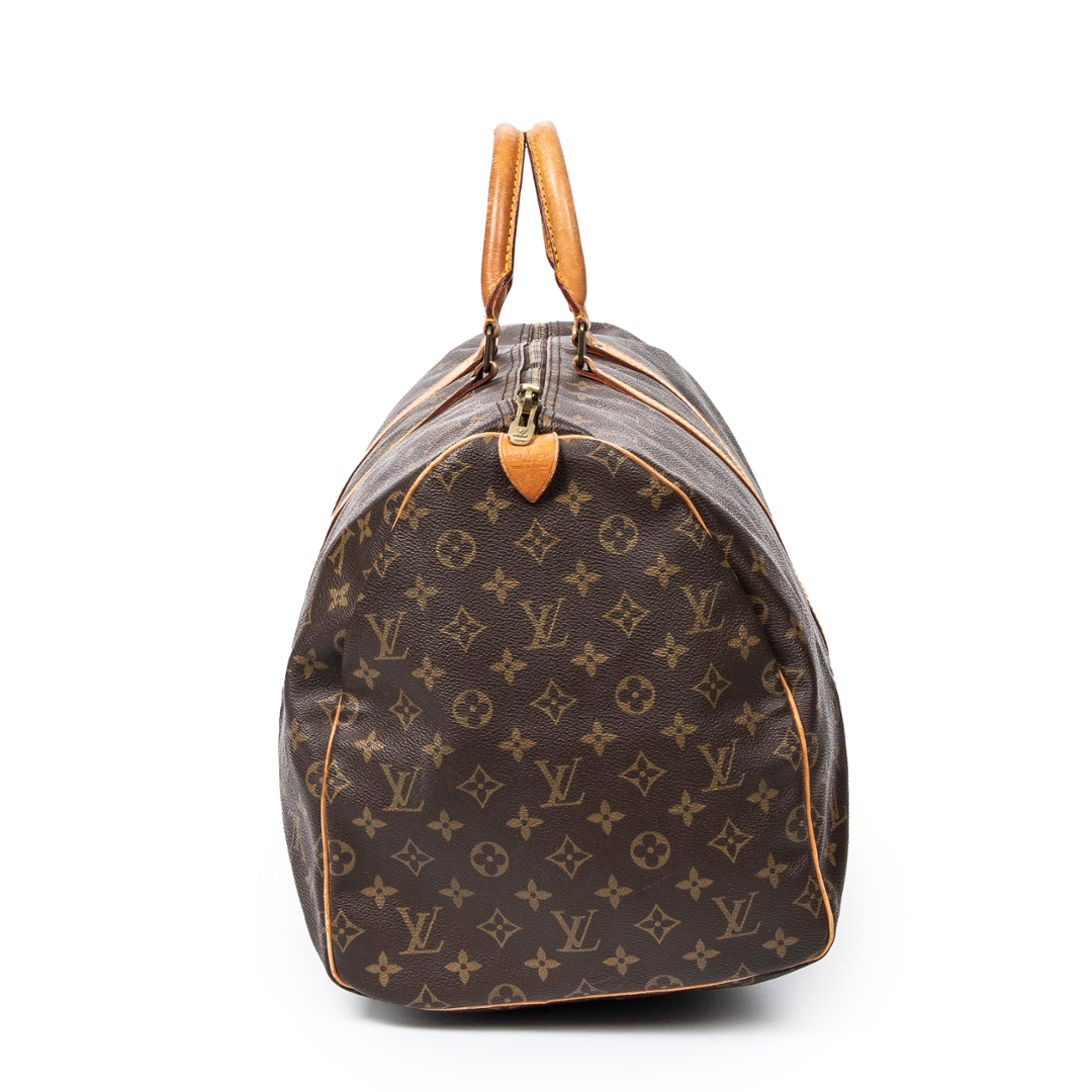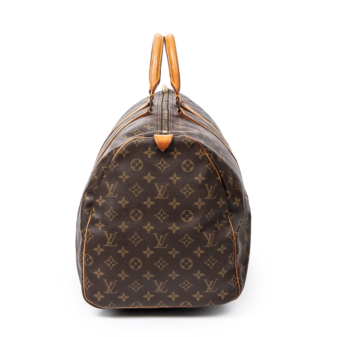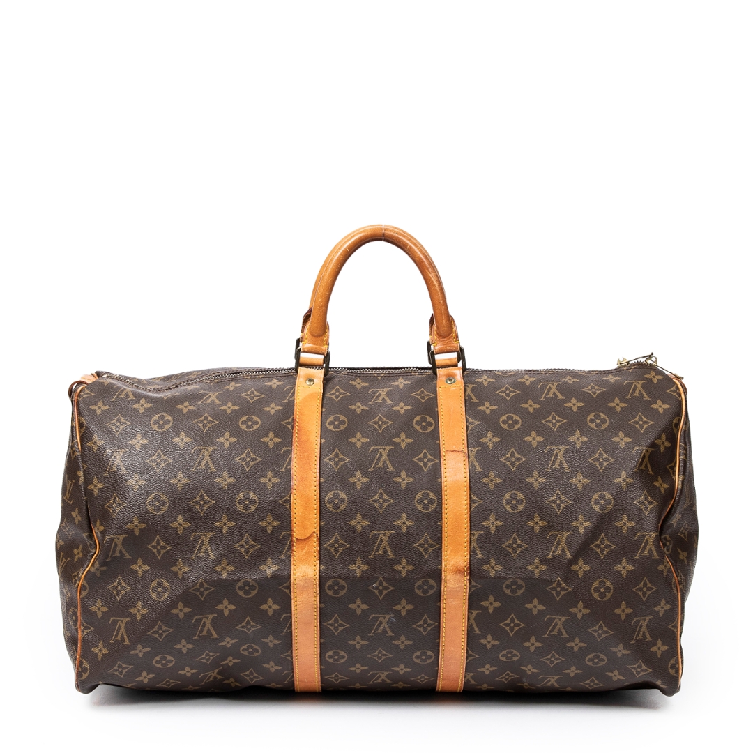 A vintage Louis Vuitton monogram coated canvas Keepall bag, showcasing one of the most iconic travel designs ever produced. Crafted from the house’s signature coated canvas with the instantly recognisable LV monogram pattern, the piece is complemented by natural leather trims, rolled handles, and gold-tone hardware, creating a timeless and distinguished aesthetic.