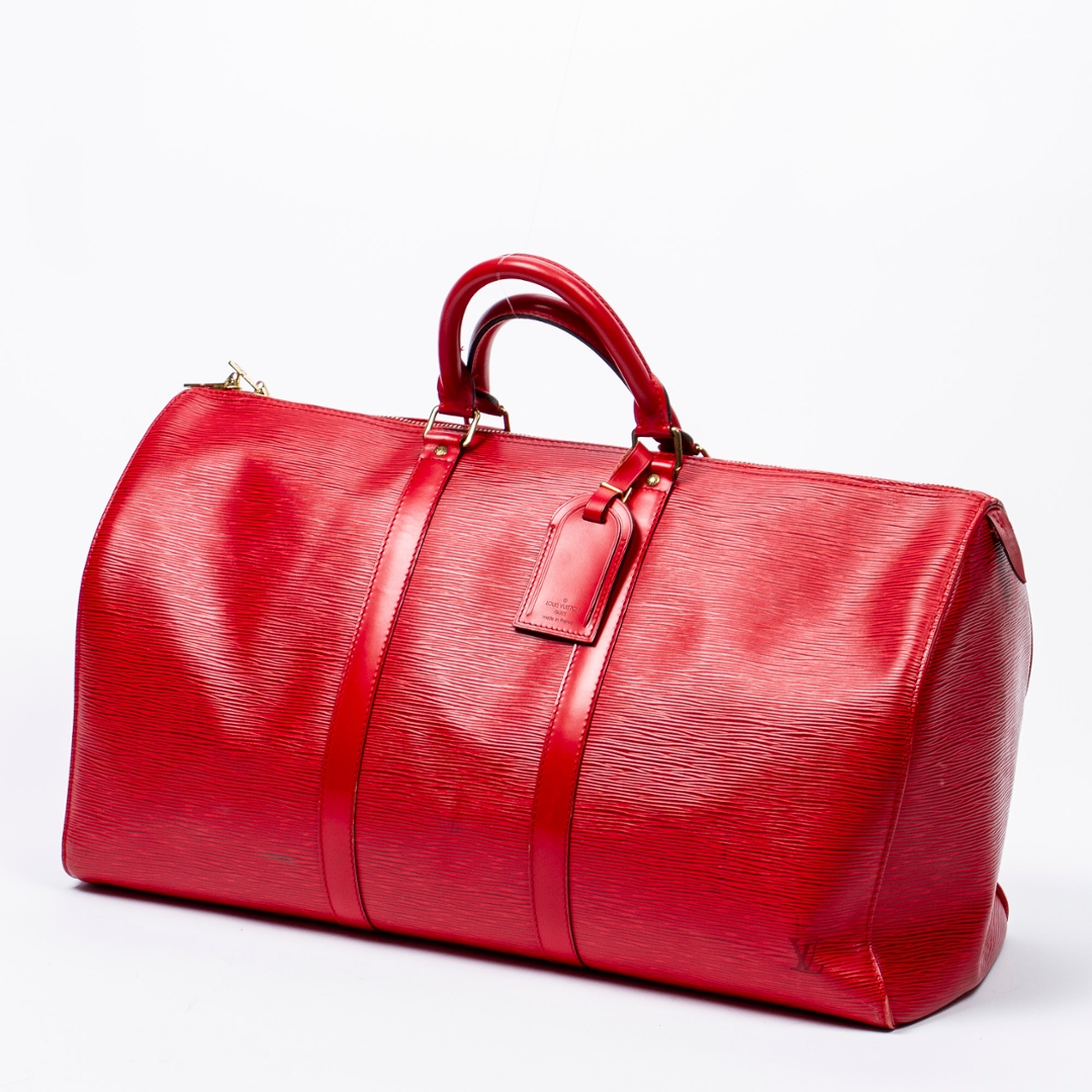 A vintage Louis Vuitton red calf leather Keepall bag with a certificate of authenticity. Approximately 29cm height, 52cm width.