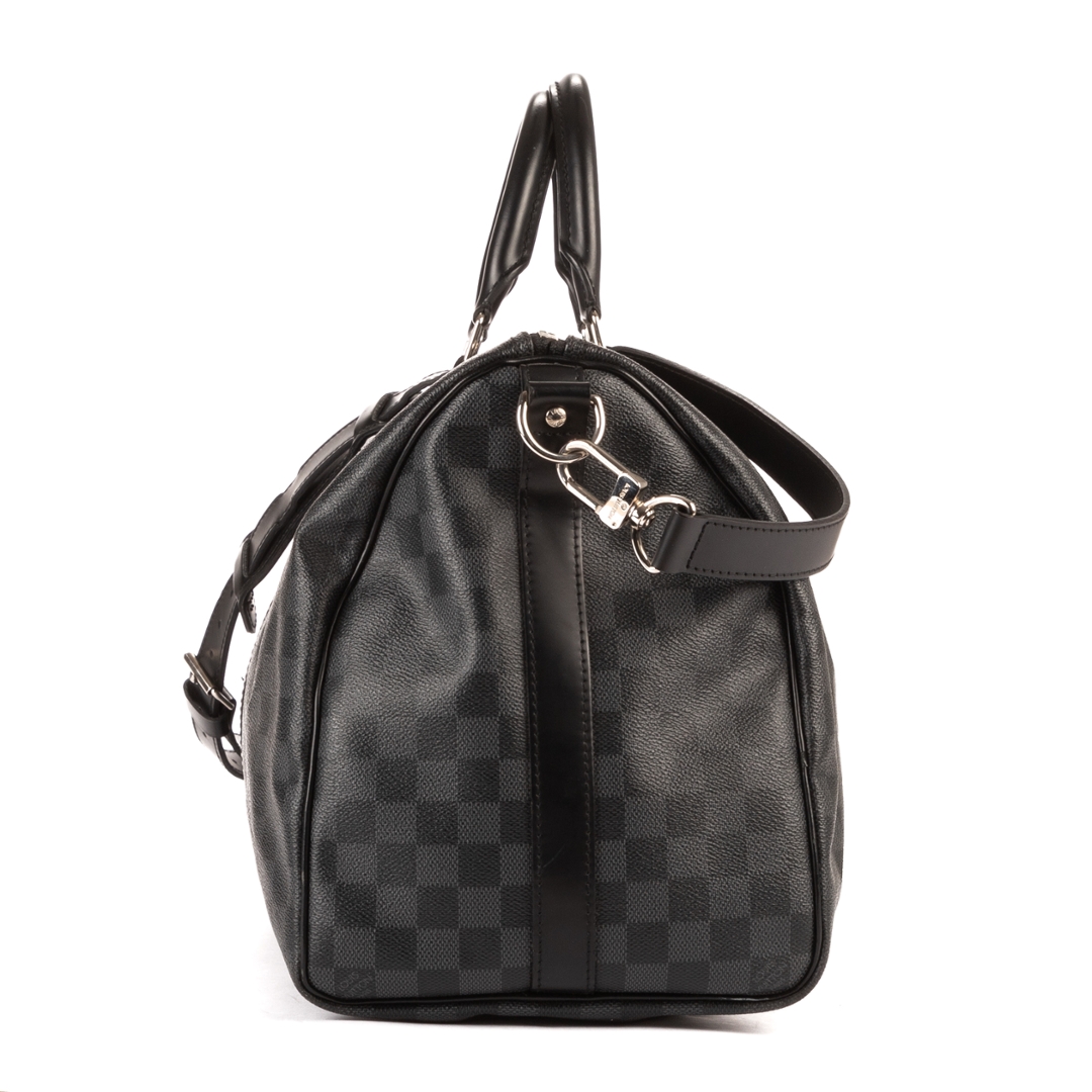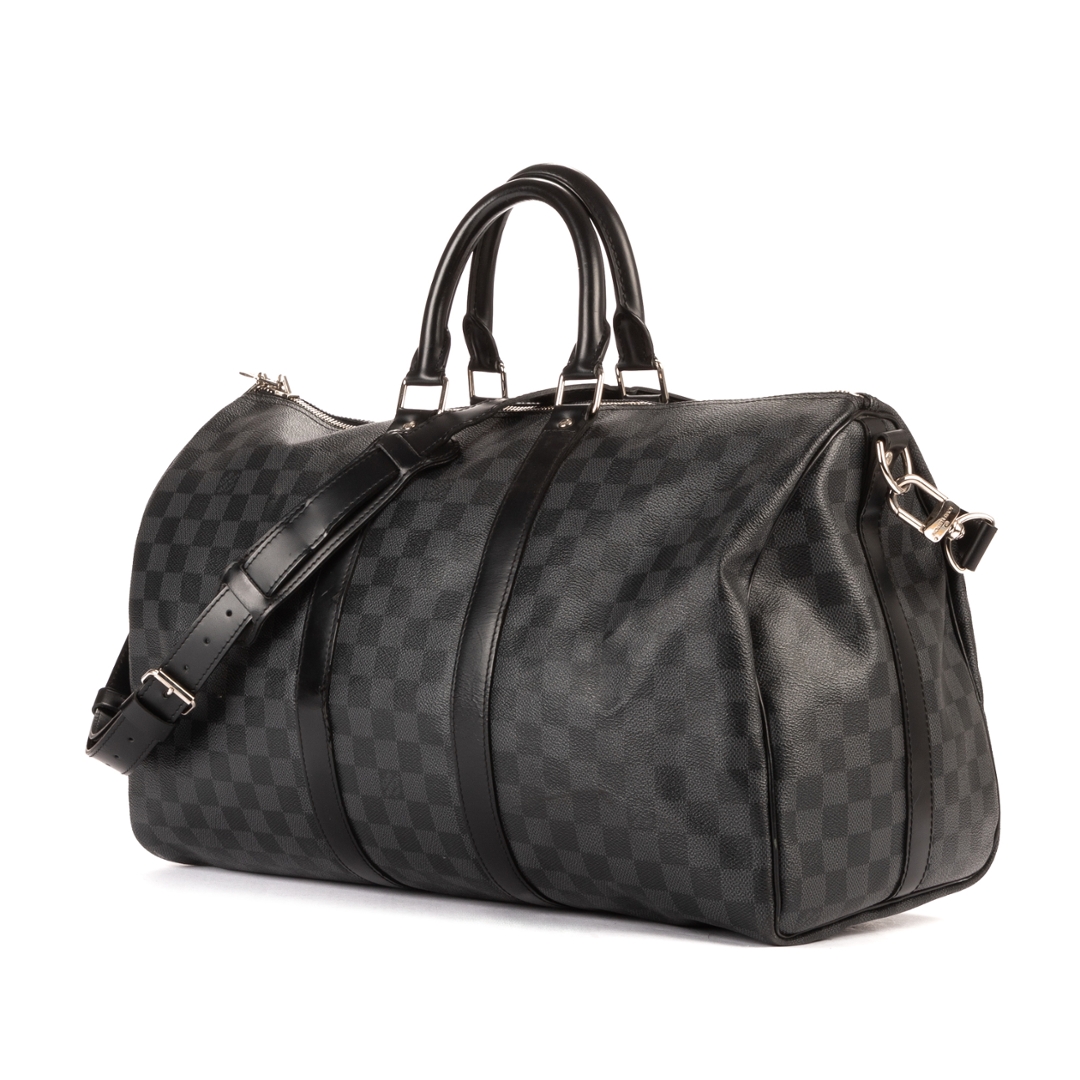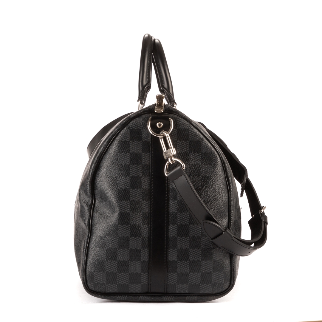 A vintage Louis Vuitton Damier Graphite coated canvas Keepall Bandoulière bag, presenting a contemporary take on the house’s iconic travel design. Crafted in the sleek black and grey Damier Graphite pattern with matching leather trims, rolled handles, and silver-tone hardware, this piece offers a refined and modern aesthetic while maintaining classic Louis Vuitton appeal.