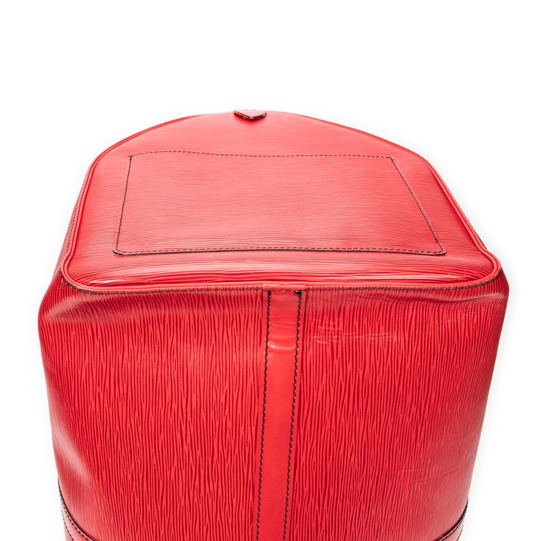 A vintage Louis Vuitton Keepall bag crafted in striking red calf leather, featuring the house’s signature textured finish and distinctive black contrast stitching. This bold interpretation of the classic travel silhouette is complemented by matching rolled handles and gold-tone hardware, delivering a statement piece that blends heritage design with a contemporary edge.