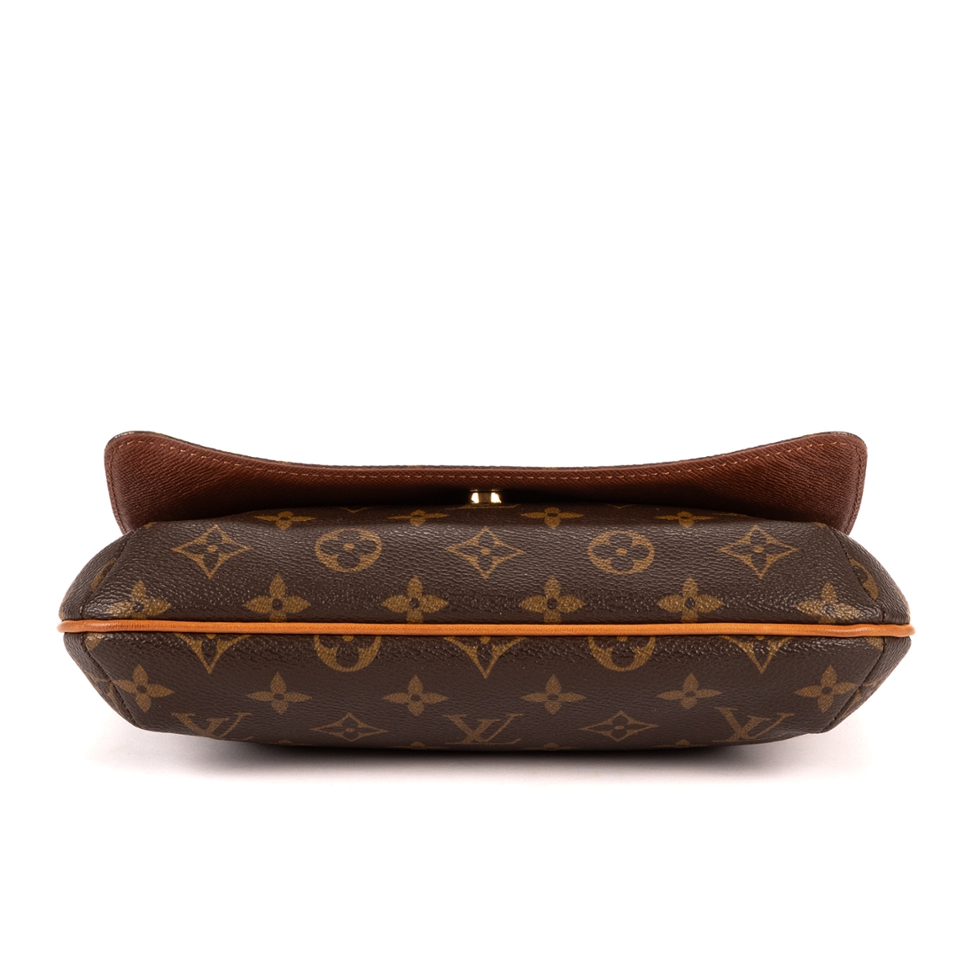 A vintage Louis Vuitton Musette Tango bag crafted in the house’s signature monogram coated canvas, offering a compact and effortlessly elegant silhouette. The clean flap-front design is paired with natural leather trim and a slim adjustable shoulder strap, creating a timeless piece that transitions seamlessly from day to evening wear.