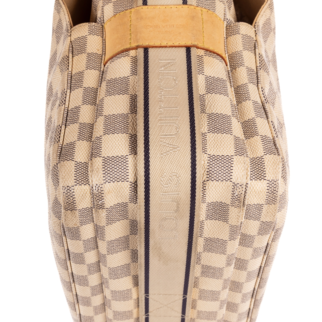 A vintage Louis Vuitton Naviglio bag crafted in refined white coated canvas, showcasing the house’s signature checkerboard pattern in a lighter, more contemporary palette. The structured silhouette is complemented by natural leather trim and a wide adjustable shoulder strap, delivering a practical yet elevated everyday design.