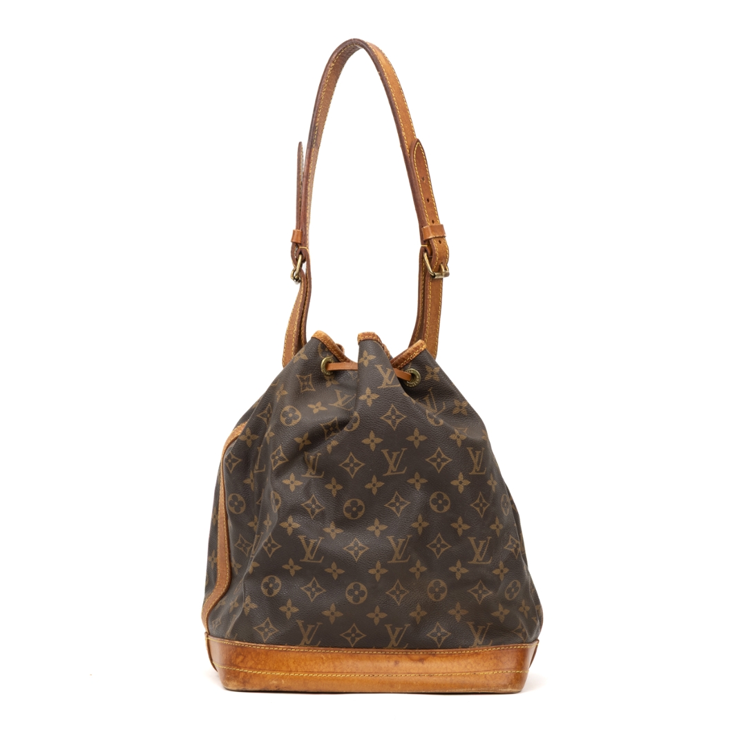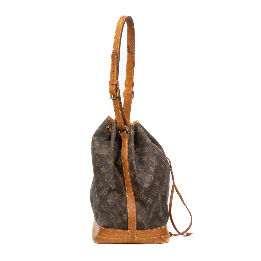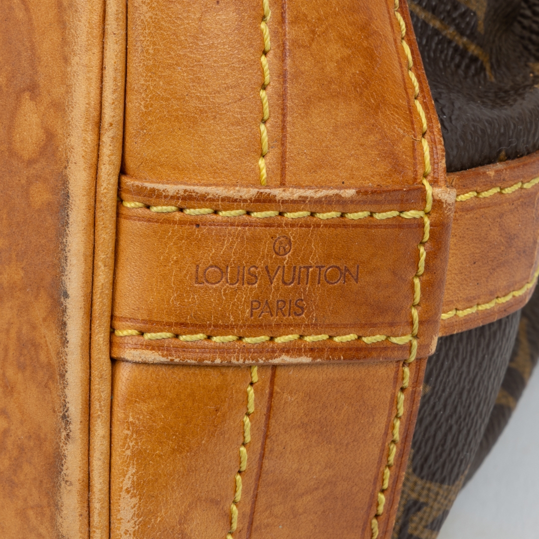 A vintage Louis Vuitton Noé bag crafted in the house’s iconic monogram coated canvas, showcasing a timeless silhouette originally designed for both function and style. The instantly recognisable pattern is complemented by natural leather trim, a structured base, and a classic drawstring closure, creating a relaxed yet refined bucket profile.