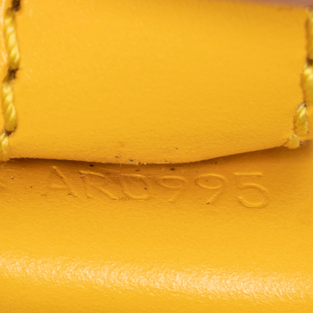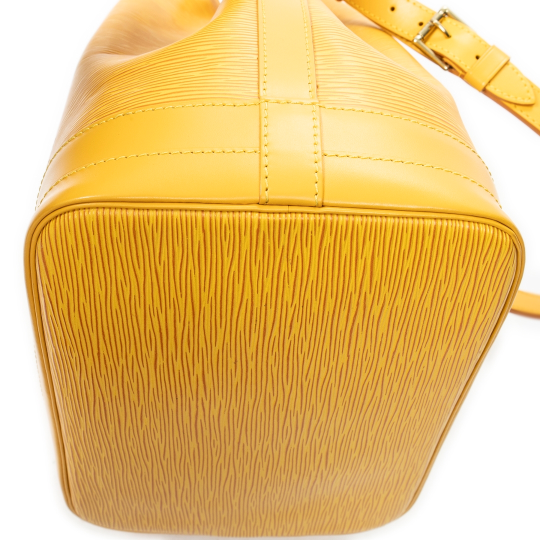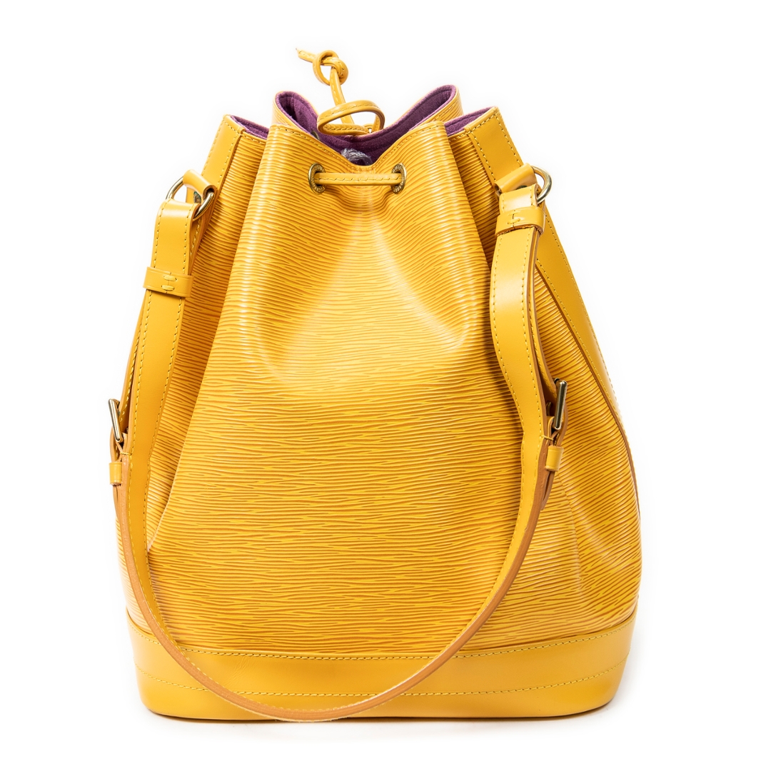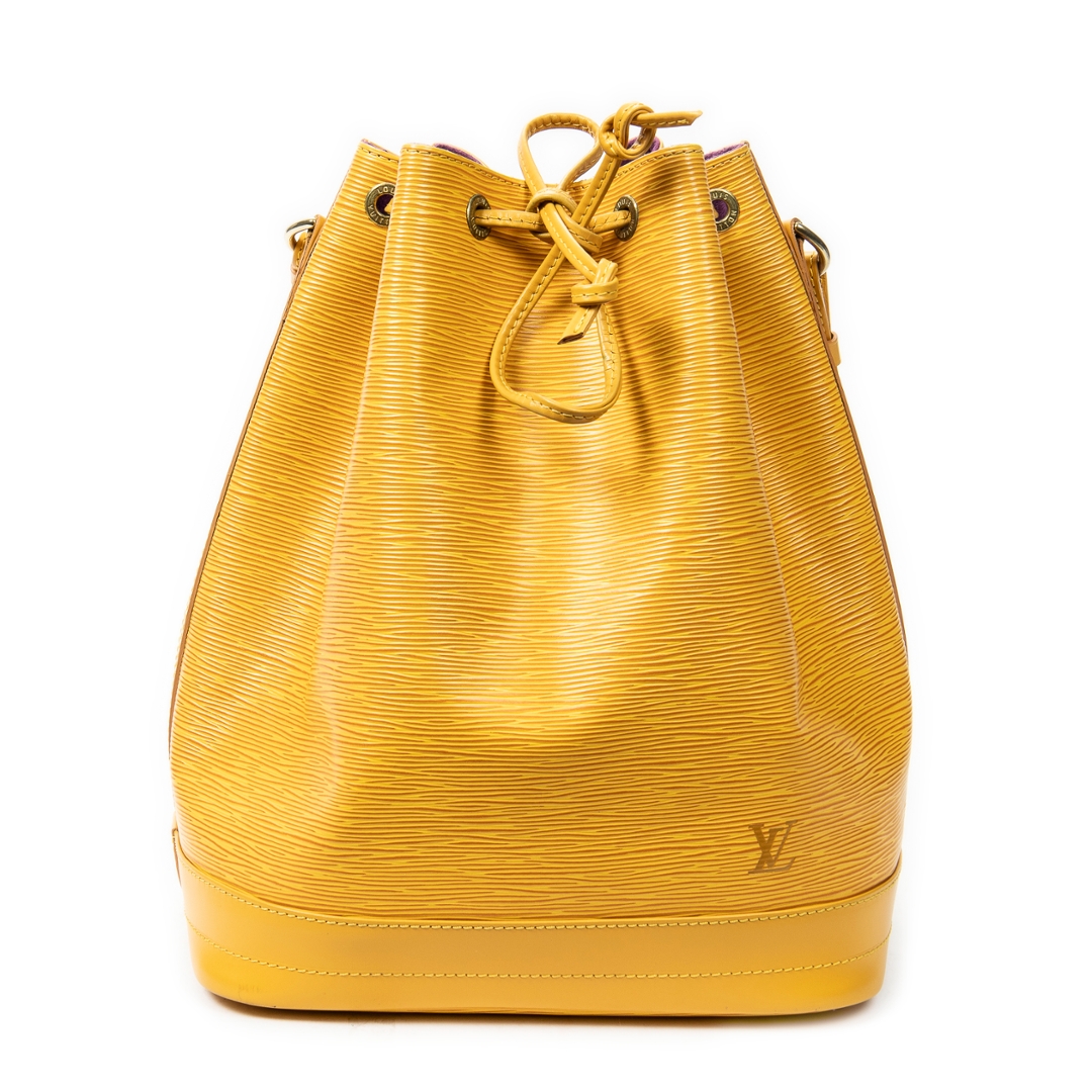 A vintage Louis Vuitton Noé bag crafted in vibrant yellow textured calf leather, offering a bold and distinctive take on one of the house’s most iconic silhouettes. The structured bucket design is enhanced by the signature drawstring closure and tonal leather trim, while the rich colourway adds a striking statement to this timeless piece.