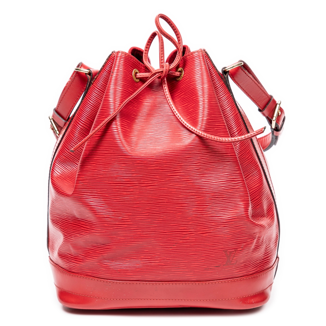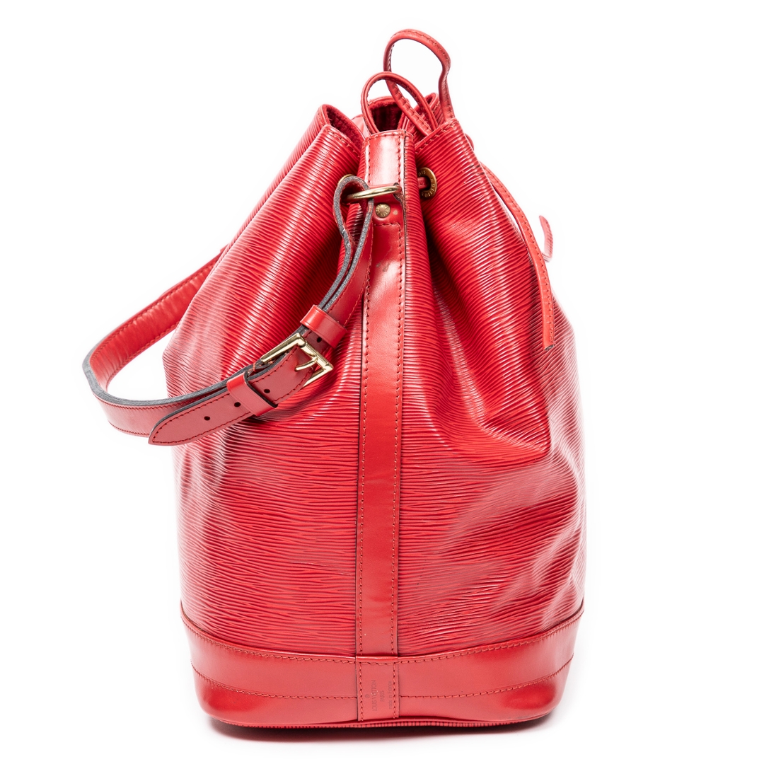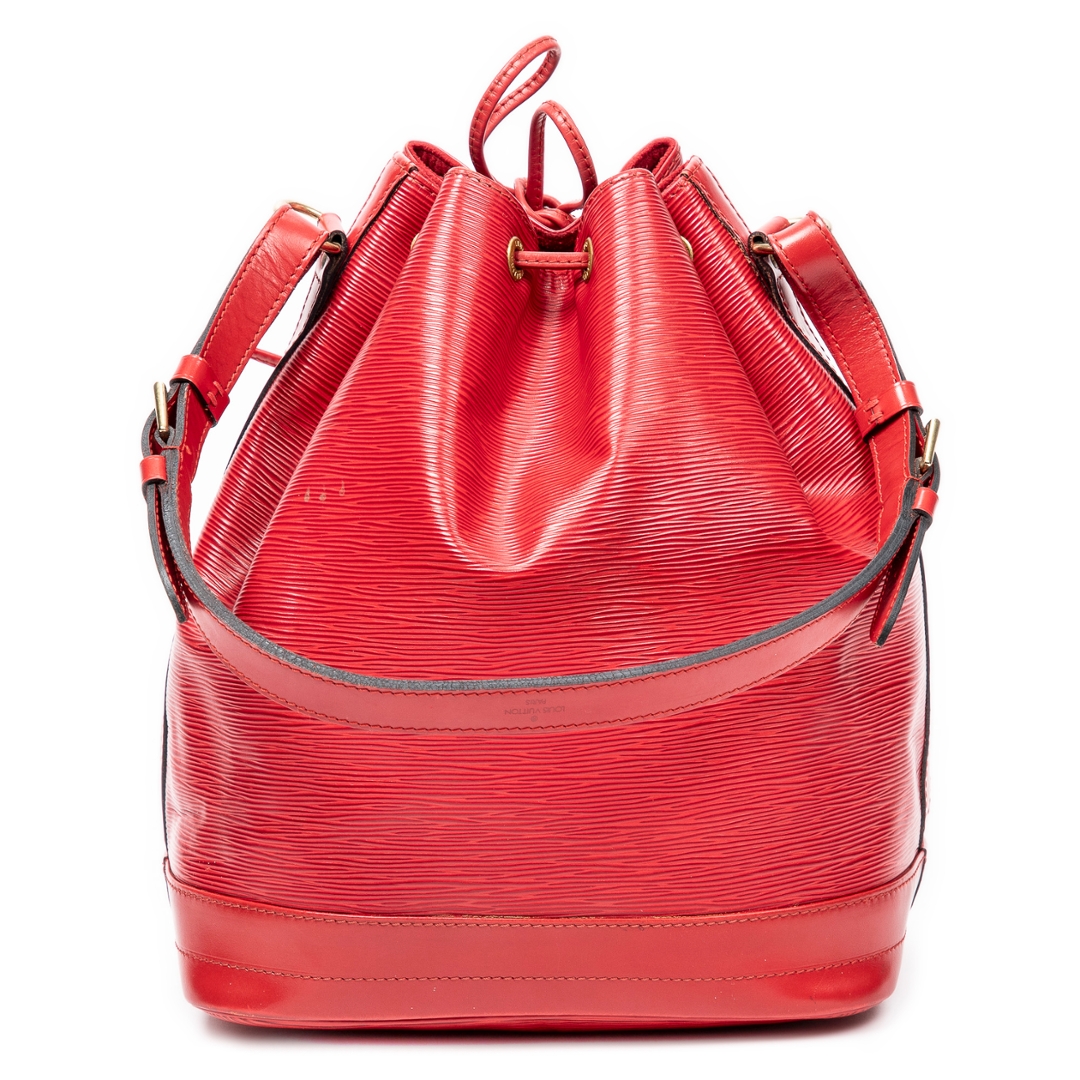 A vintage Louis Vuitton red calf leather Noe bag with a certificate of authenticity. Approximately 34cm height, 27cm width.