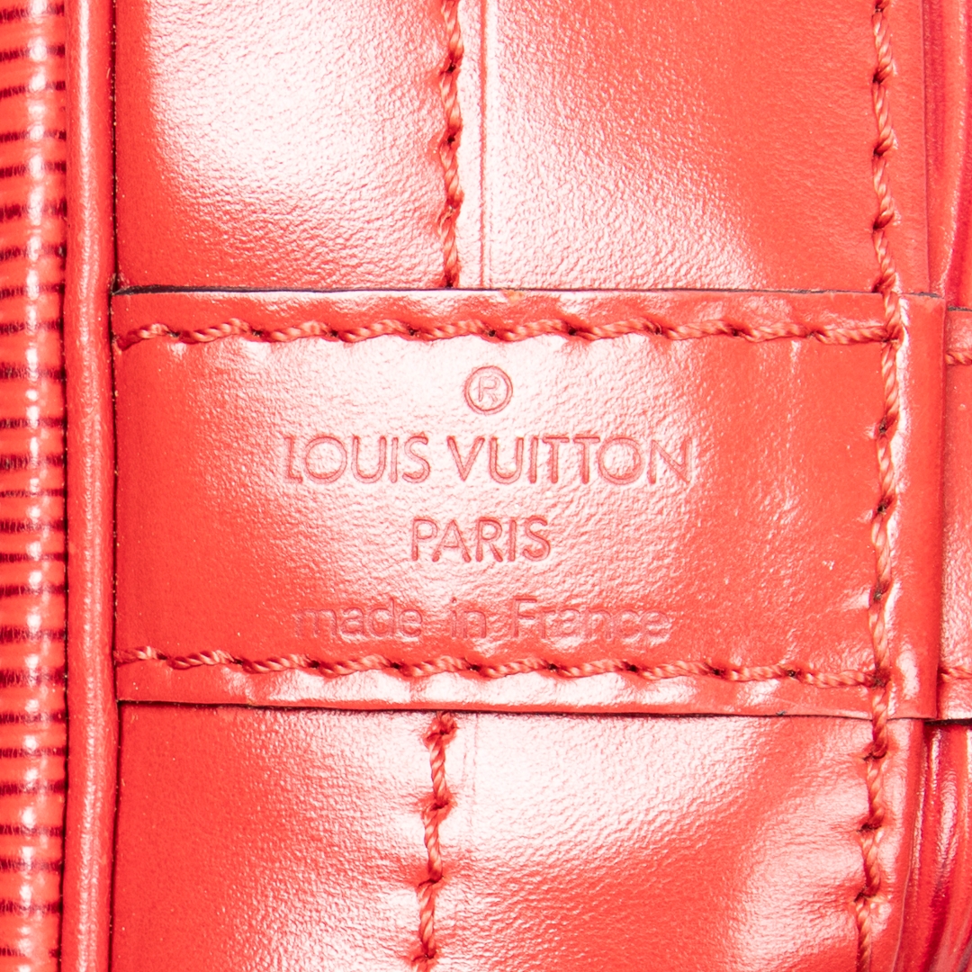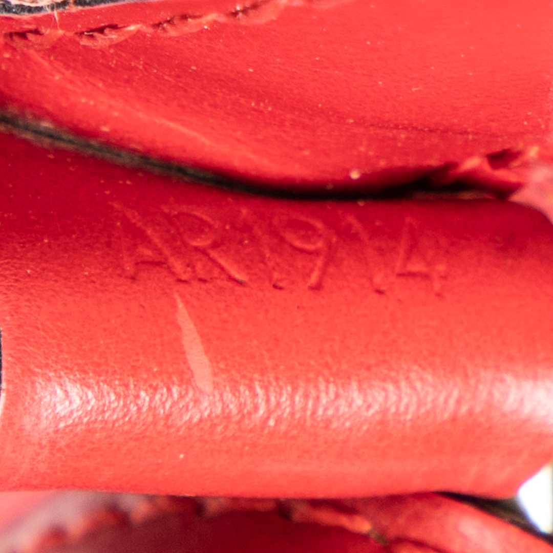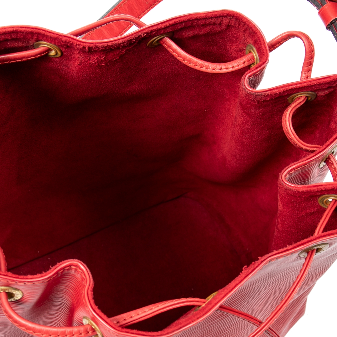 A vintage Louis Vuitton red calf leather Noe bag with a certificate of authenticity. Approximately 34cm height, 27cm width.